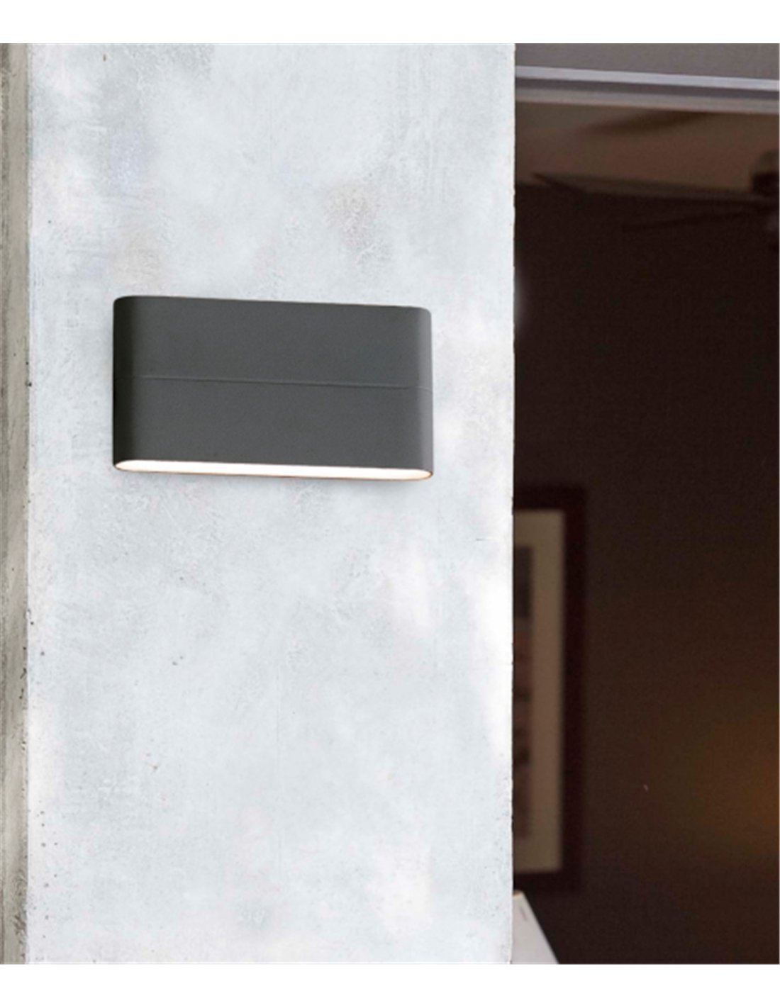Aplique de estilo moderno con tecnología LED para iluminación exterior, fabricado en aluminio inyectado con difusor de cristal opal. La fuente de iluminación es LED de 12W y luz cálida, driver incluido. Este aplique LED con haz de luz en la parte inferior y superior es ideal para iluminación decorativa en jardines y terrazas.