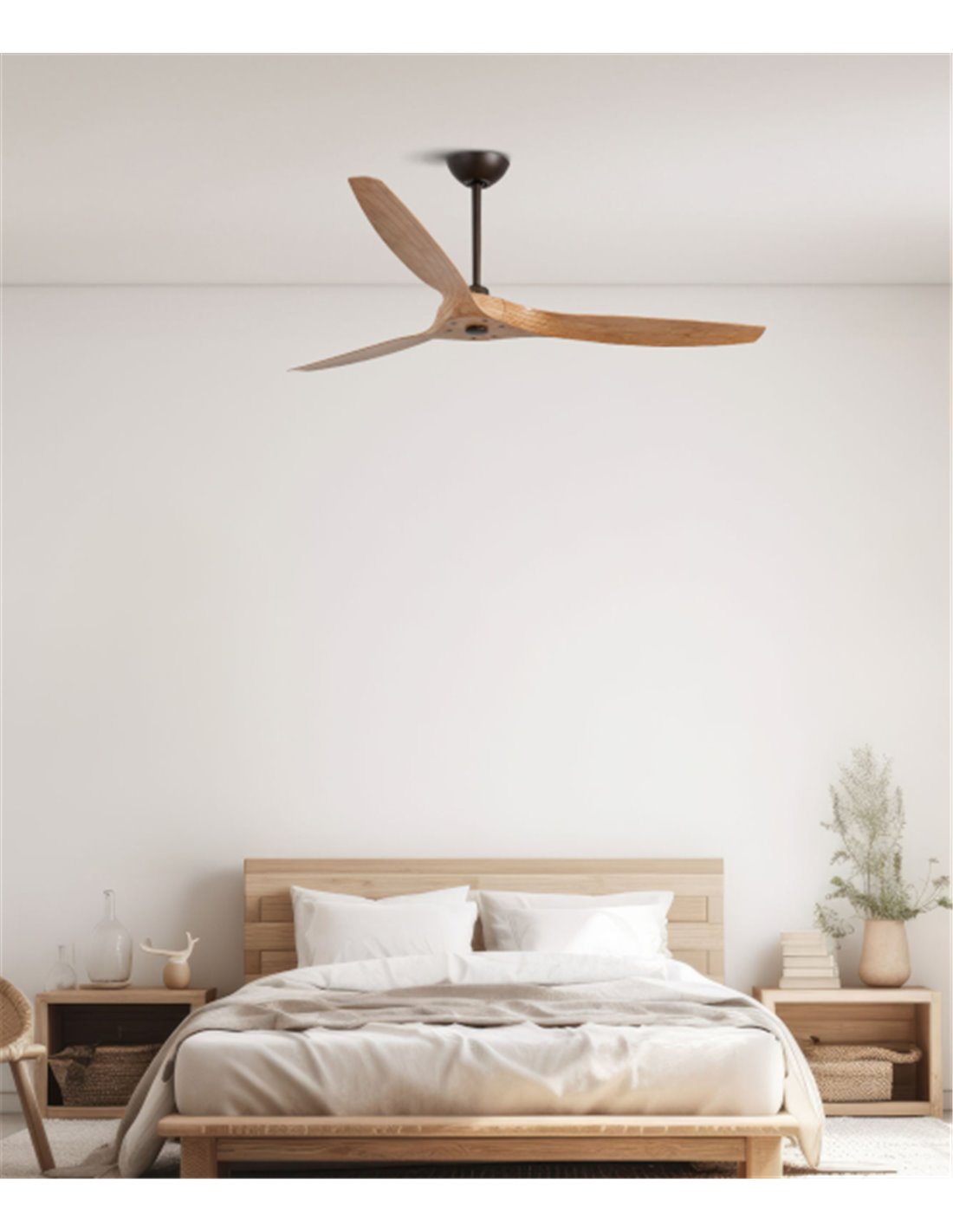 Sobre ventilador de techo Morea Smart de Faro; ventilador sin luz inteligente, motor DC, palas de madera clara, 6 velocidades, función inversa, apto techo inclinado