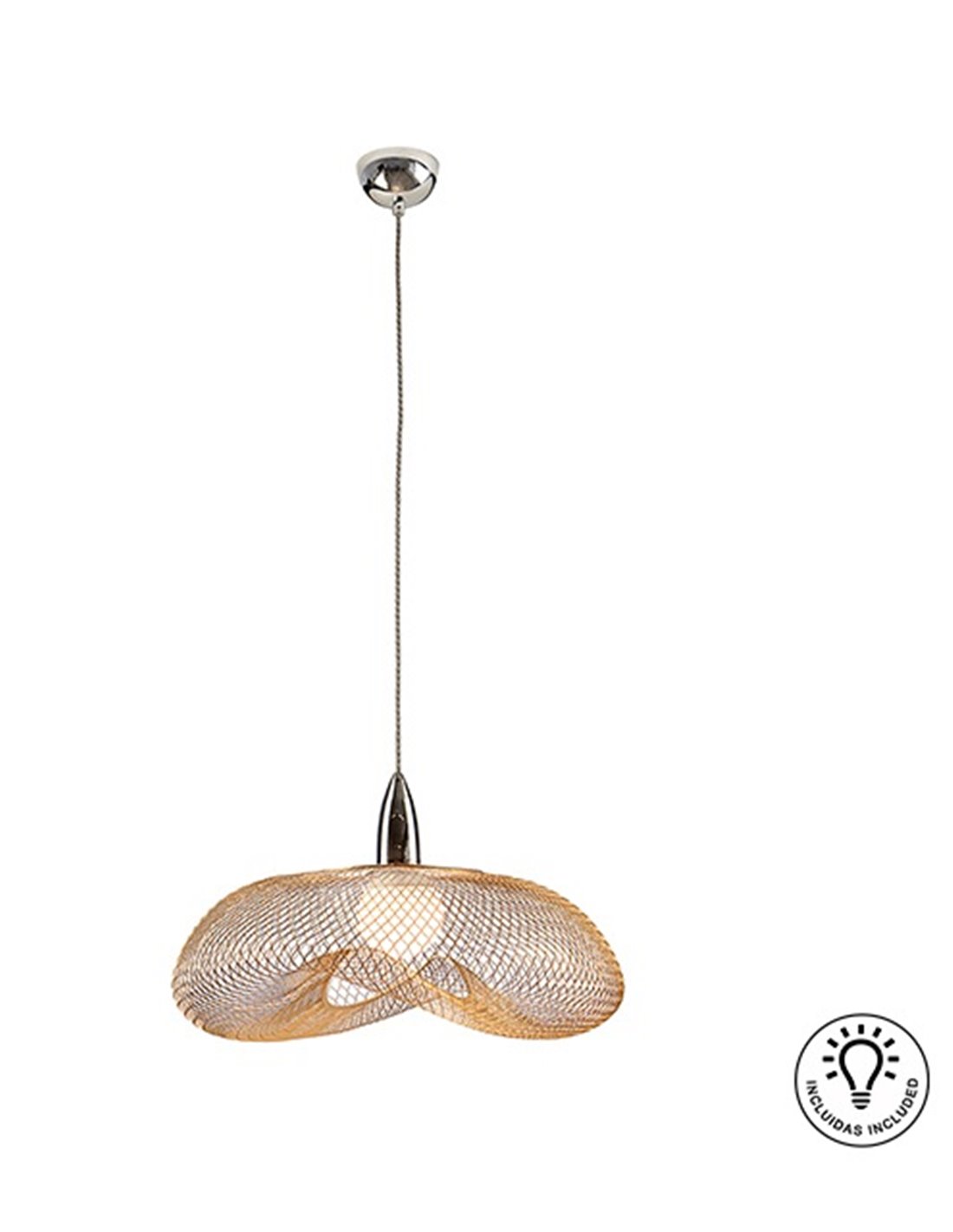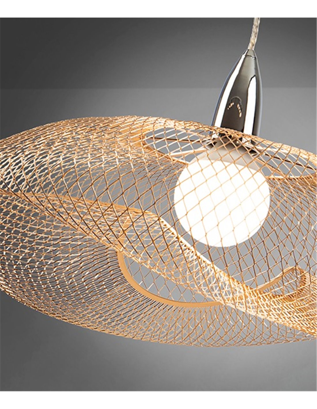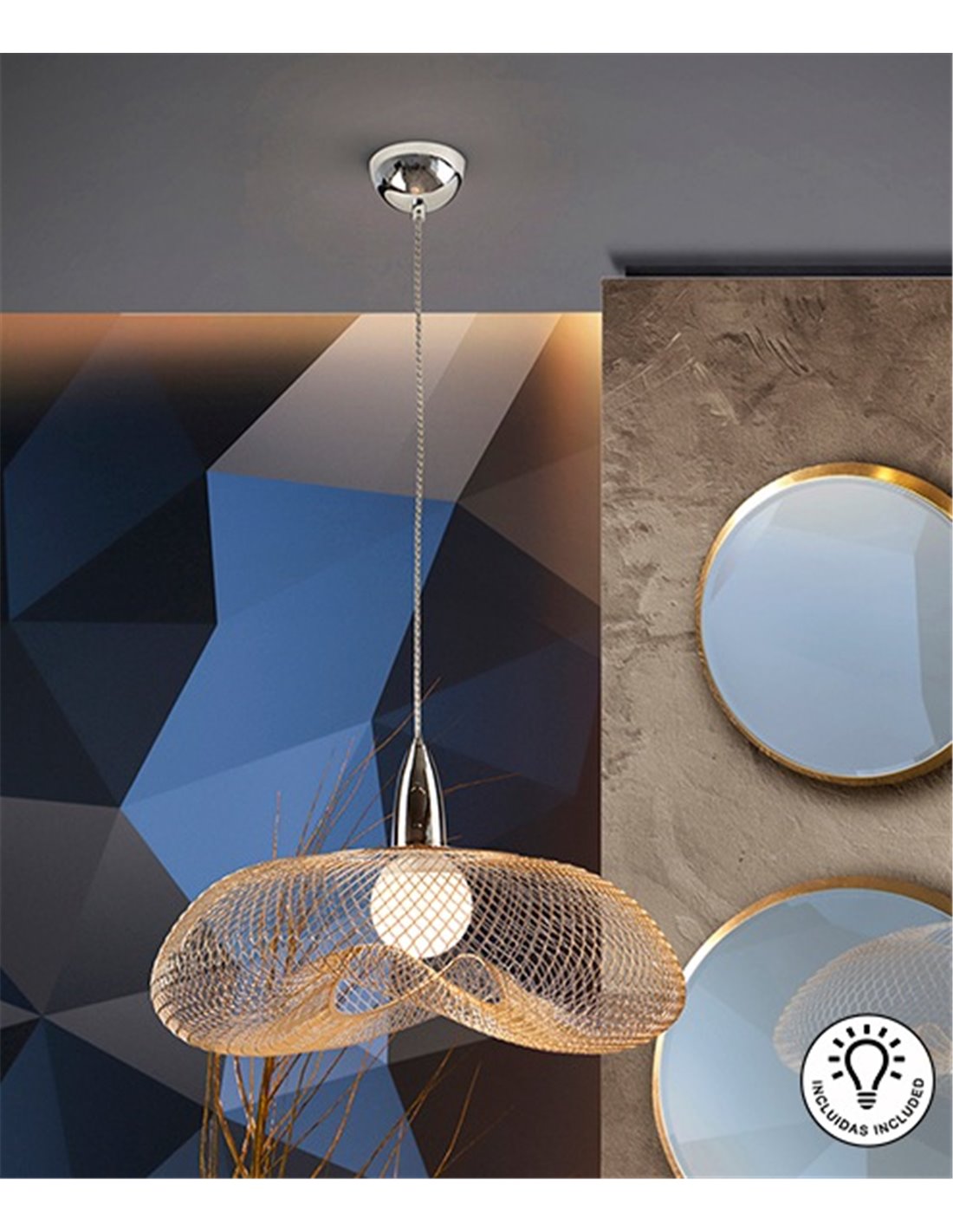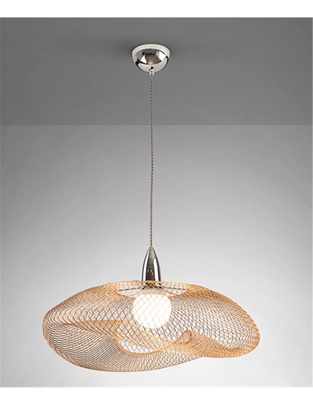 Lámpara de 1 luz realizada en metal cromado y tulipa de malla metálica oro brillo.