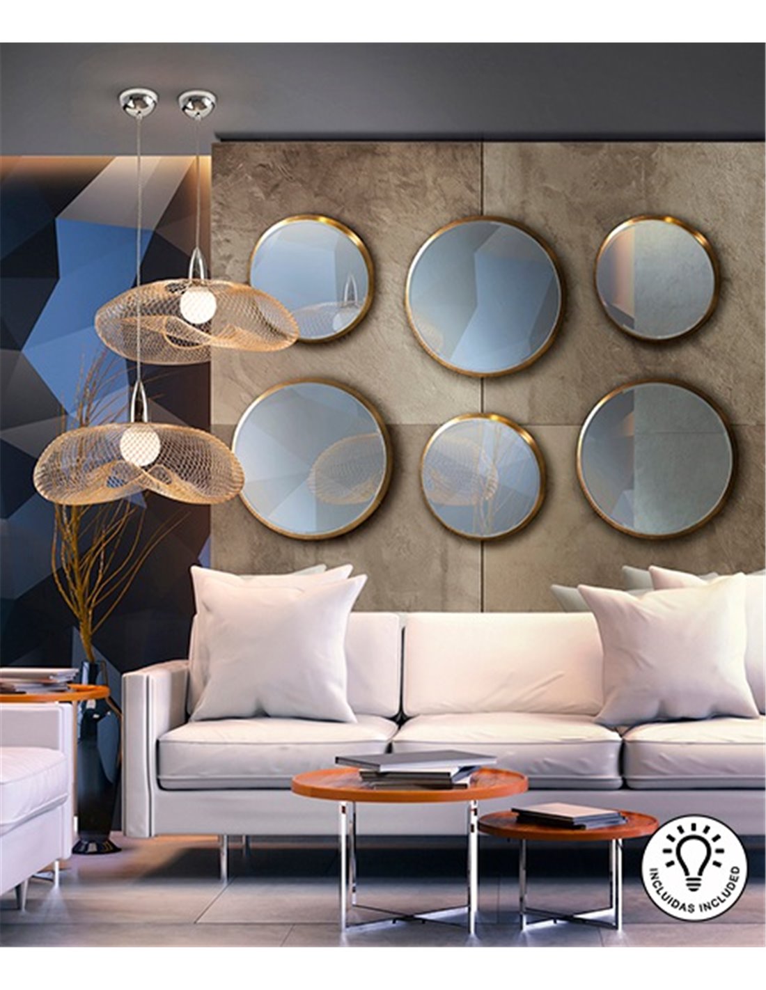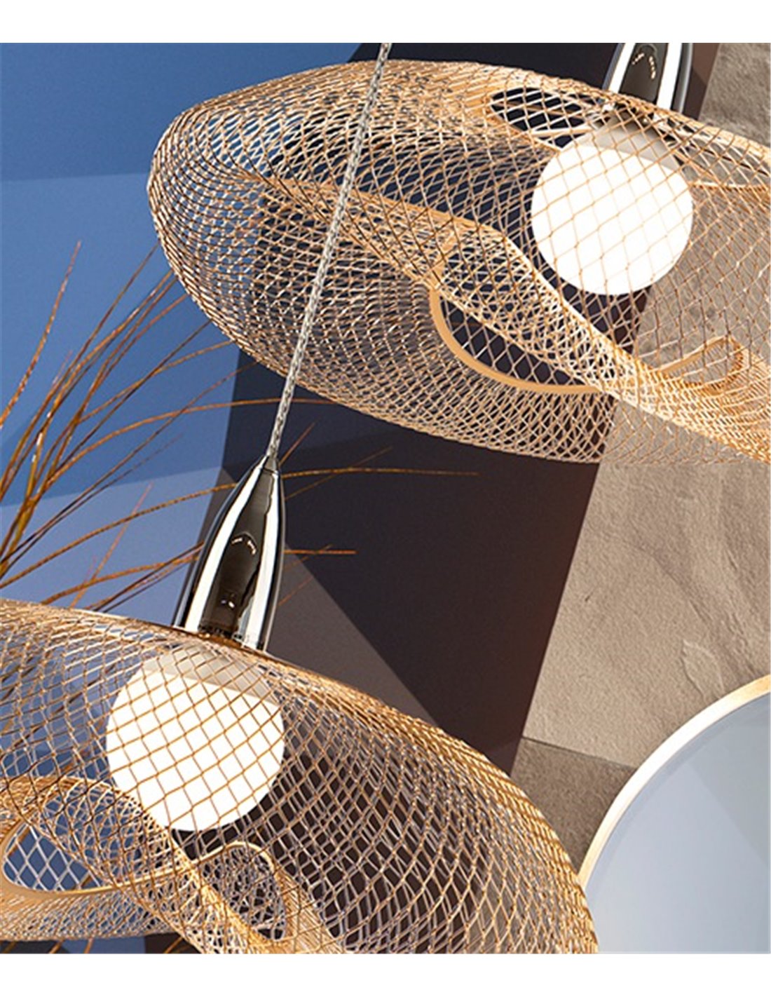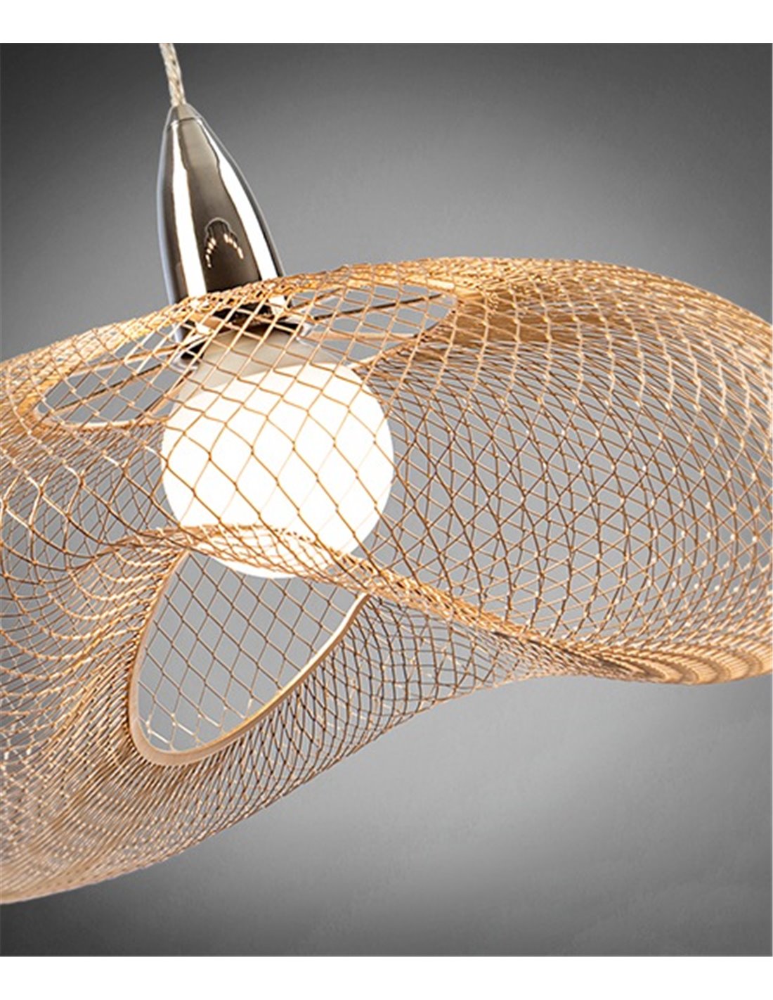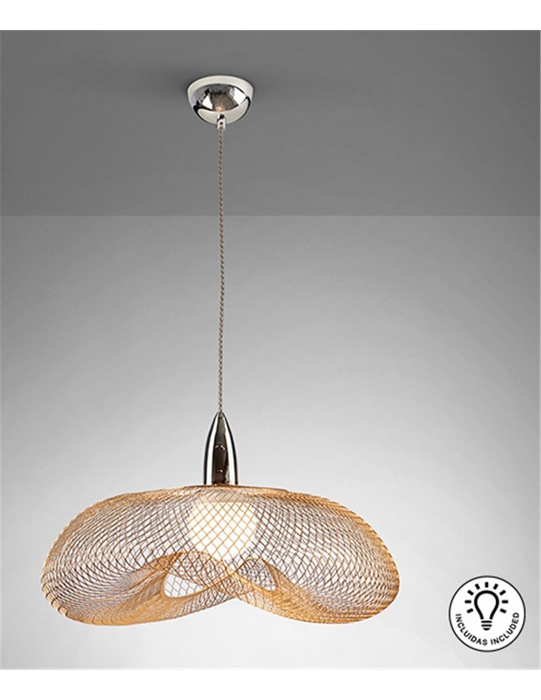 Lámpara de 1 luz realizada en metal cromado y tulipa de malla metálica oro brillo.