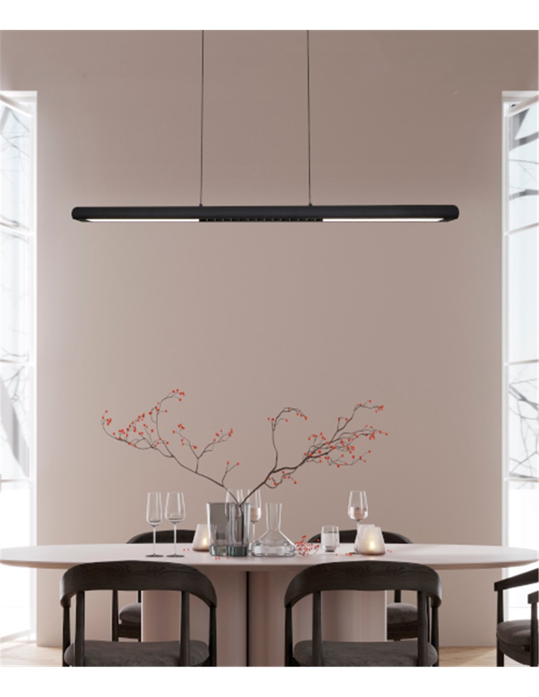 Sobre lámpara colgante Lineal de Mantra; diseño horizontal de 120 cm, altura regulable, disponible en 3 colores, brillo regulable, LED 3000K