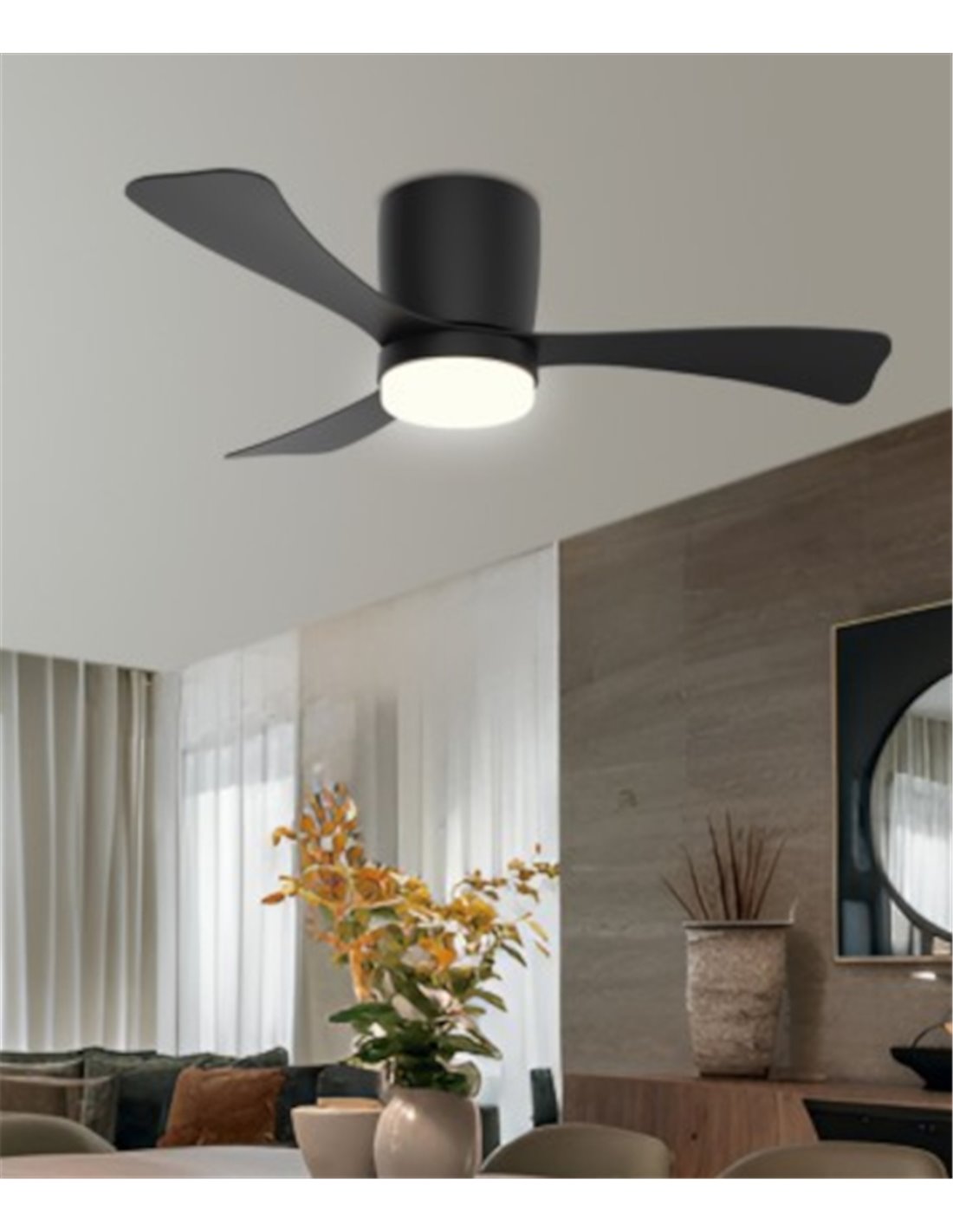 Ventilador de techo moderno de 107 cm, compacto y eficiente, ideal para estancias medianas donde se busca confort y diseño contemporáneo. Equipado con motor DC de bajo consumo, ofrece 6 velocidades, con un consumo que oscila entre 8W y 33W, y un funcionamiento ultrasilencioso (entre 33 dB y 48 dB).