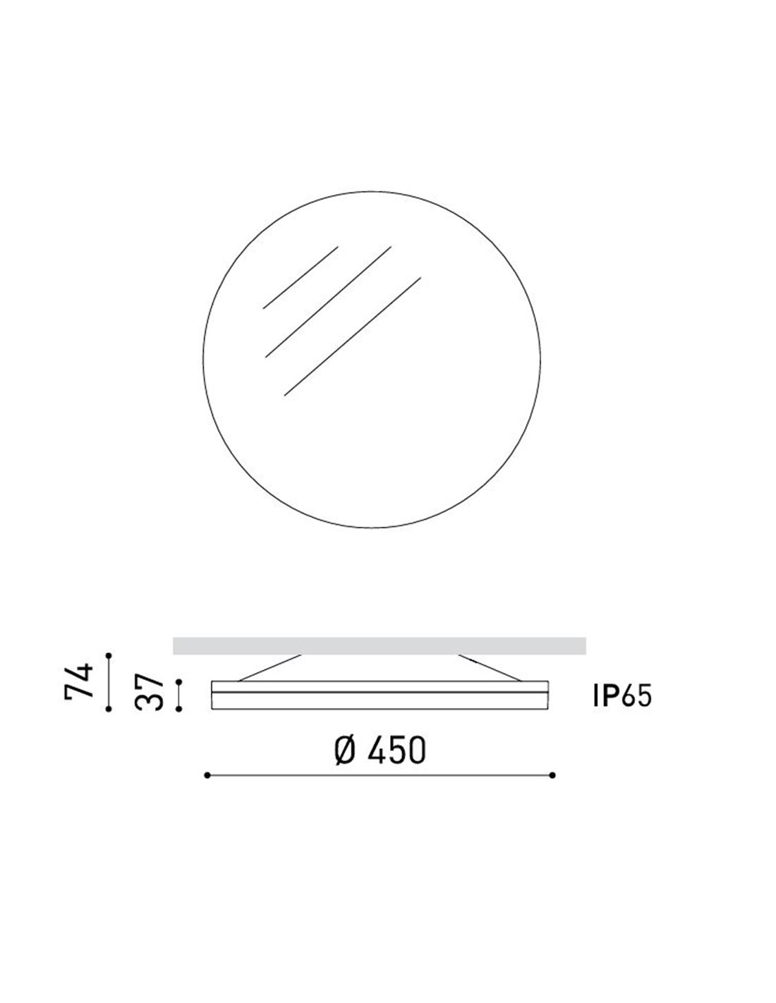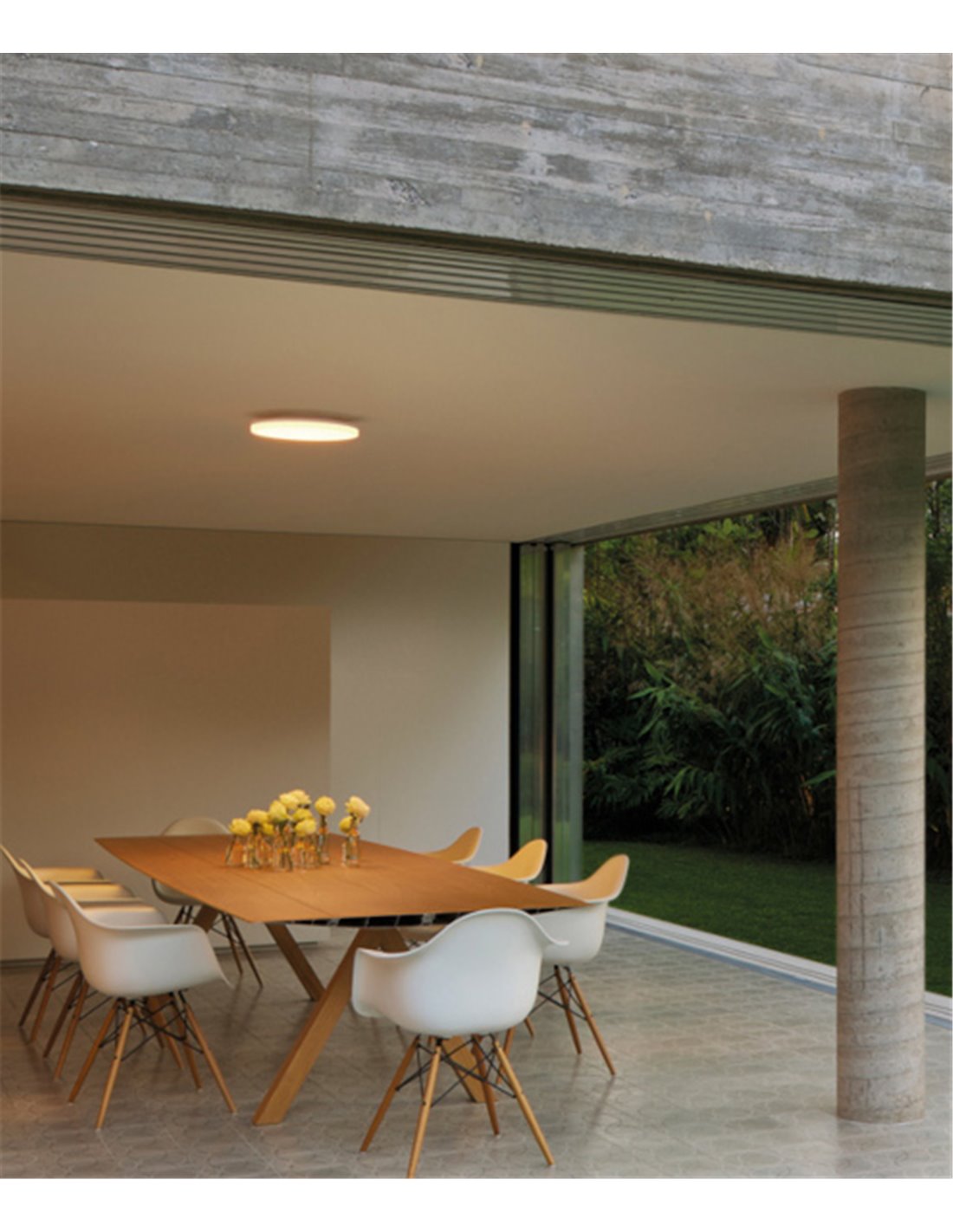 Vola es un plafón de techo de superficie con una forma redonda de 45 cm y una pantalla de policarbonato blanco que difunde la luz de manera suave, evocando el efecto de la luz natural. Con un alto grado de protección (IP65), es apto tanto para interiores como para exteriores.