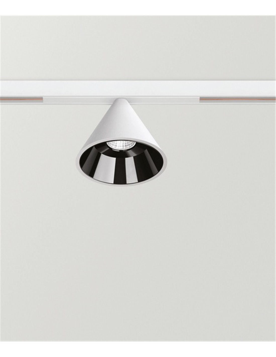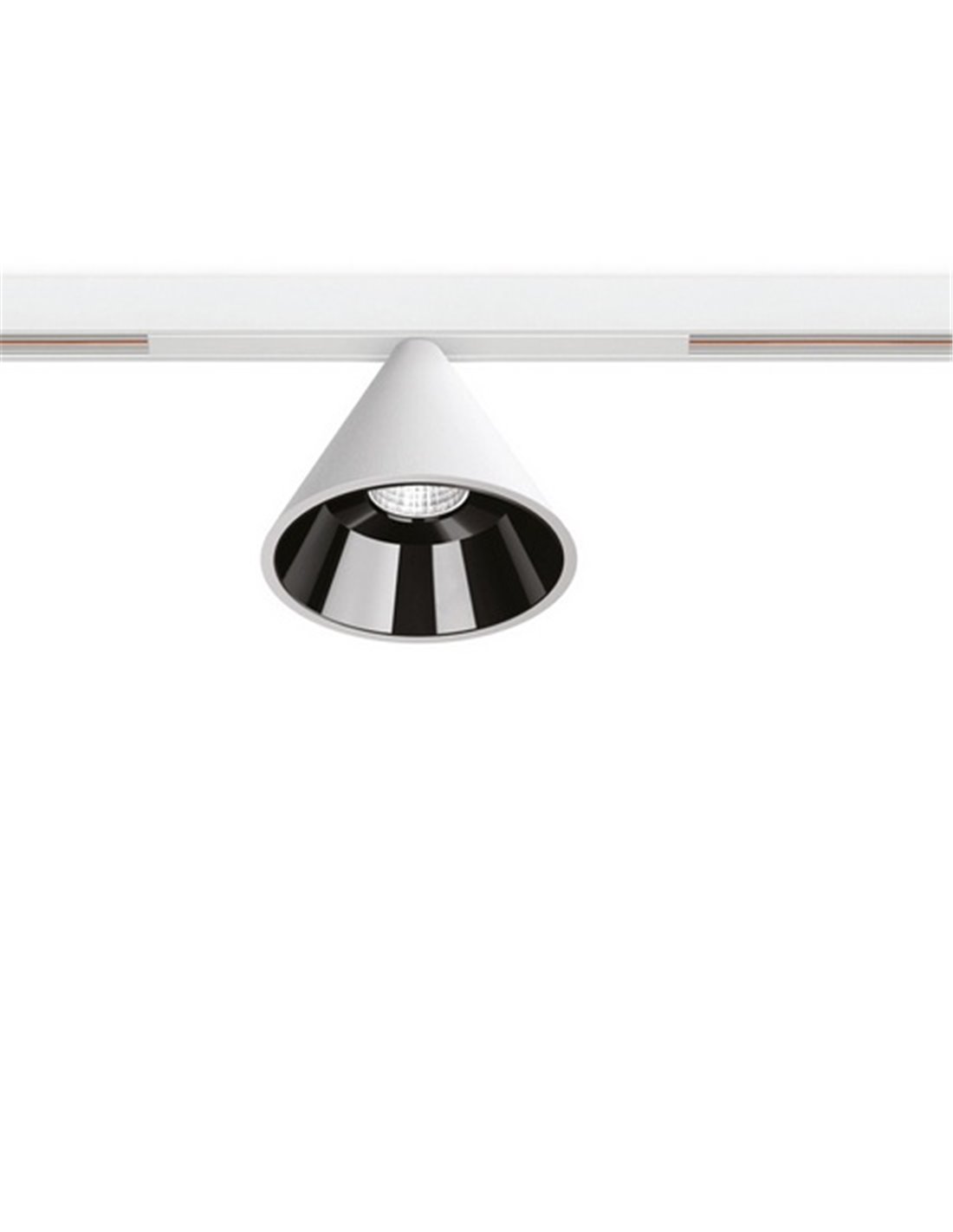Wiz 48V Short es un downlight de carril con pantalla cónica que incorpora el efecto The Invisible Black al sistema Track. Su diseño parte de una geometría precisa para ofrecer eficiencia lumínica y una estética cónica. Disponible en acabado blanco con interior negro o completamente negro, con opciones de regulación DALI o sin regulación, y temperaturas de color de 2700K, 3000K o 4000K. Cuenta con tecnología LED de 12,4W, ángulo de apertura de 38° y flujo luminoso entre 1470 y 1550 lúmenes según la temperatura elegida, cuánto más fría, más lúmenes emite.