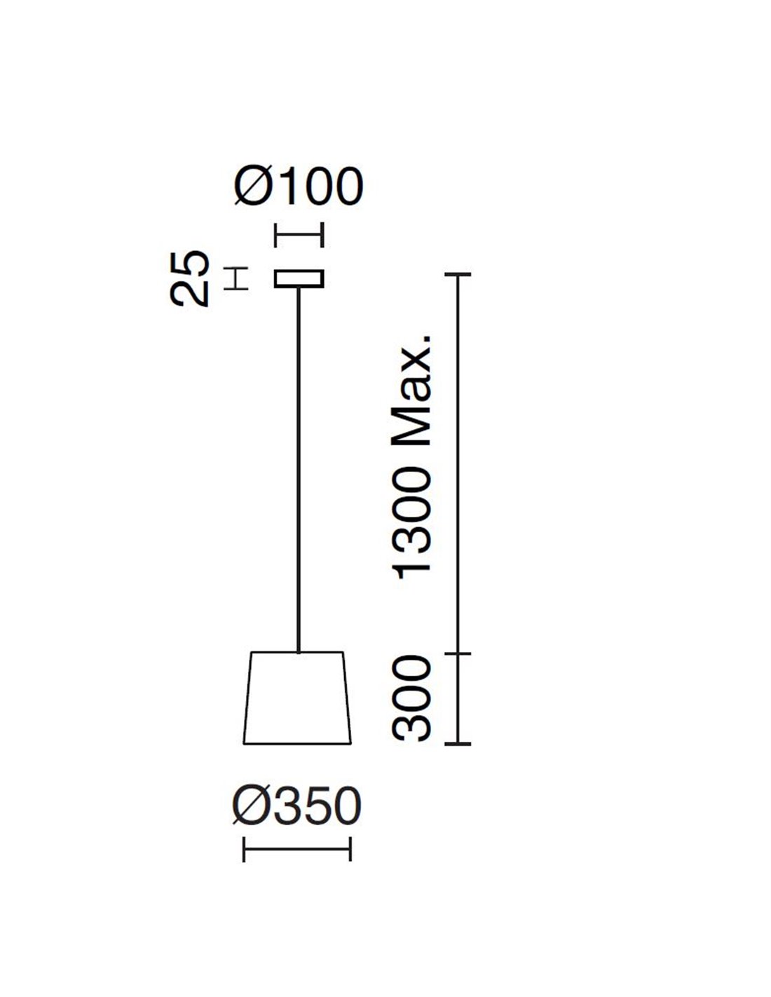 Está disponible en tres tamaños de pantalla (Ø 35 cm, Ø 50 cm y Ø 70 cm), lo que permite adaptarla fácilmente a diferentes necesidades decorativas o composiciones en grupo. Incorpora un casquillo E27 compatible con bombillas LED de hasta 15W (bombilla no incluida) y permite una altura regulable hasta 130 cm.