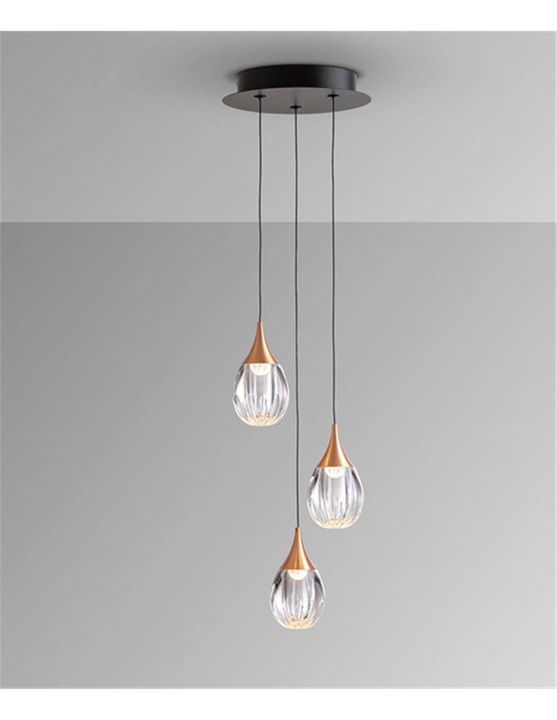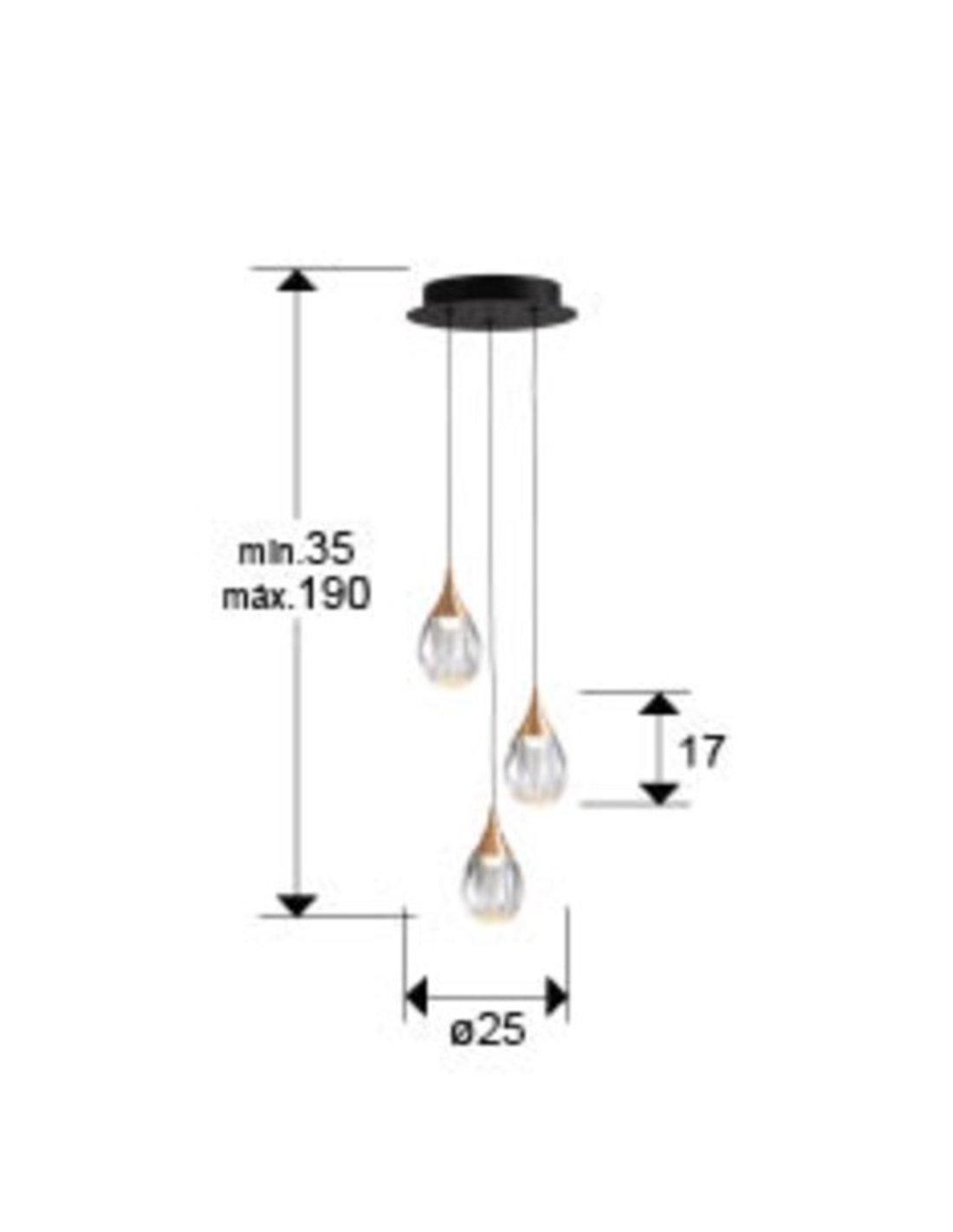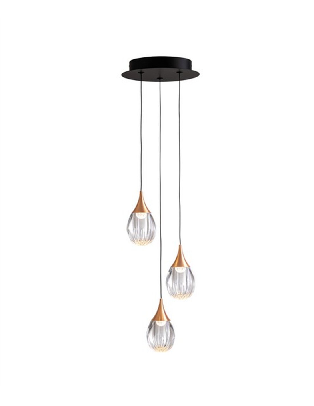 Lámpara de 3 luces realizada en metal acabado negro mate y detalles en cobre. Tulipas moldeadas de acrílico transparente. Regulable en altura. 18W LED, 639 lm, 3.000 K.
