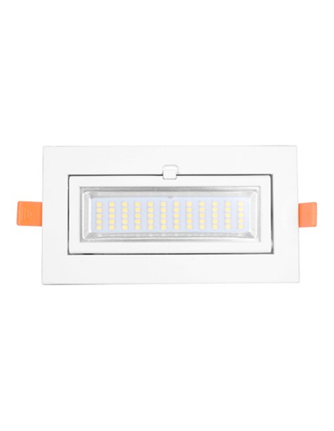 Downlight LED basculante modelo 5075 acabado blanco, IP65, potencia de 15 W, temperatura de color de 4000 K (luz neutra) o 5700K (luz fría) a elegir. Flujo lumínico de 1459 lm, ángulo de apertura de 100°, tamaño de 185 x 100 x 62 mm, para un hueco de 175 x 70 mm, peso de 640 g y hecho de aluminio.