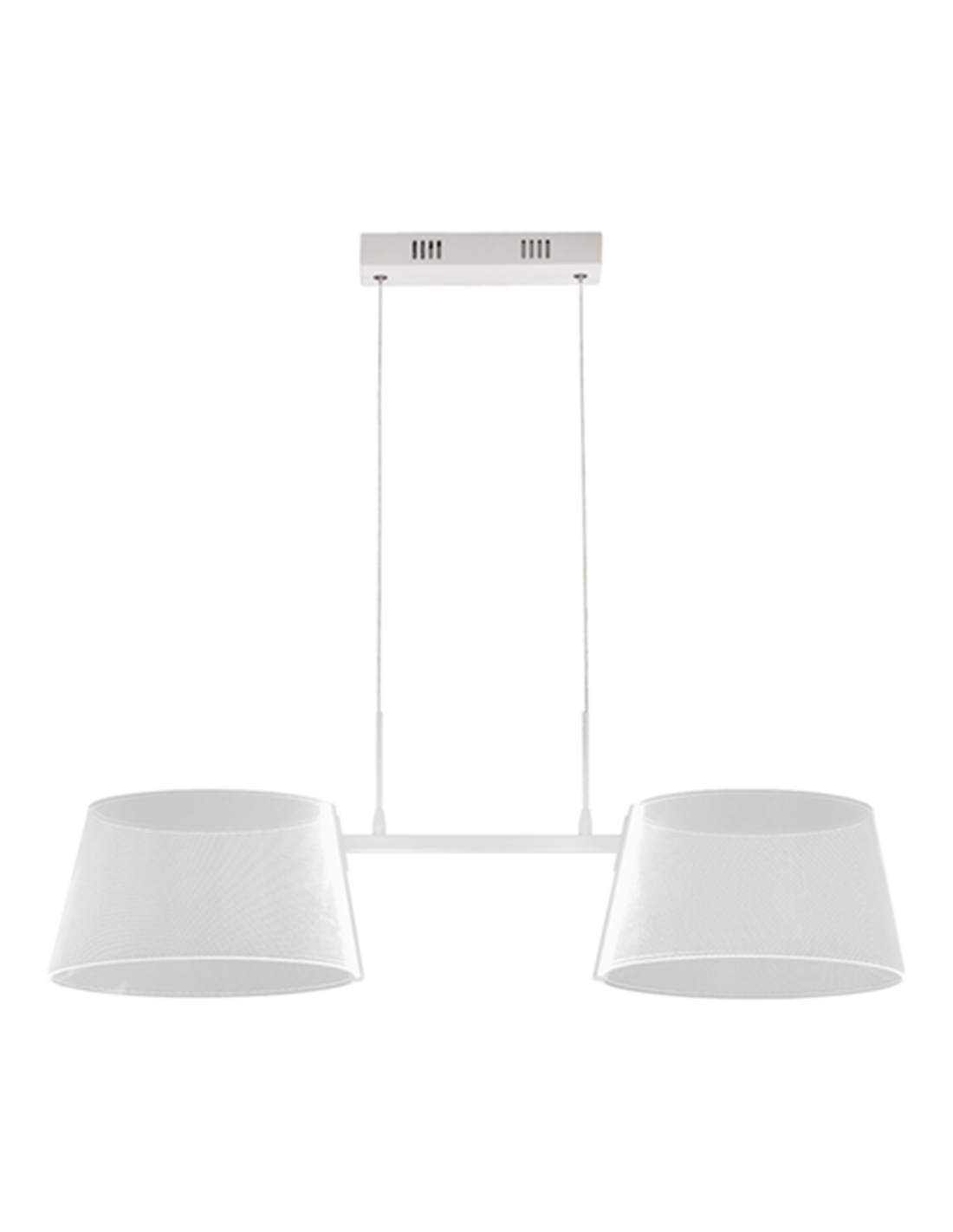 Colgante LED modelo Bilbo, acabado blanco compuesto por 2 luces con una fuente de luz de 24W 4000K. Diseño moderno. Cuerpo de aluminio y metal y difusor de metacrilato (PMMA), que hace recorrer la luz sobre su superficie transparente, creando un entorno moderno a la vez que acogedor. Medidas base: diámetro 24 cm y altura 3,5 cm; medidas tulipa: diámetro 30 cm y altura 17,5 cm.