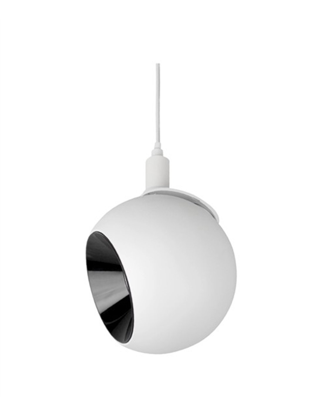 Lámpara colgante en forma de bola para carril magnético. Ofrece una potencia de 12 W y permite seleccionar la temperatura de color entre 3000 K (luz cálida) y 4000 K (luz neutra). Dispone de un ángulo de apertura de 24° y está disponible en acabado blanco arenado o negro. Mide Ø10 x 10 cm.