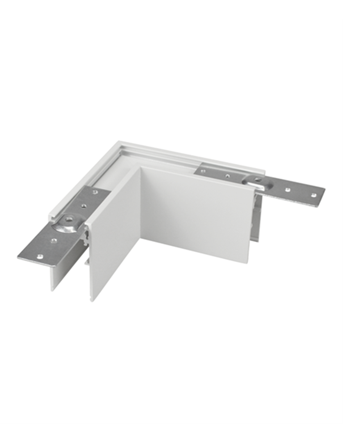 Conexión en “L” horizontal para carril magnético de superficie, disponible en acabado blanco arenado o negro.