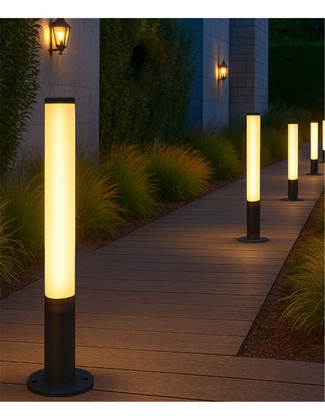 Fabricada en aluminio y policarbonato (PC), es ideal para la iluminación de caminos y jardines.