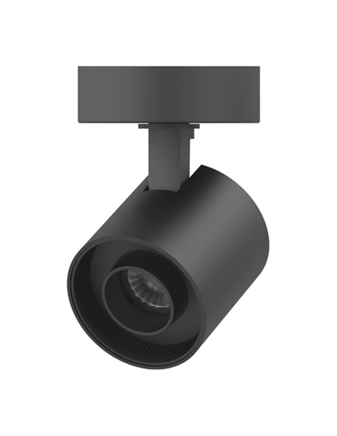 Foco de superficie LED modelo HERA en acabado negro con luz orientable. Dispone de un índice de deslumbramiento UGR10 y permite seleccionar la temperatura de color entre 3000 K (luz cálida) y 4000 K (luz neutra).