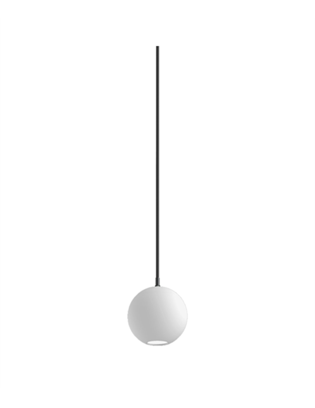 Lámpara colgante tipo bola modelo SPINNE, disponible en acabado blanco o negro. Funciona con una tensión mínima de 48 V y cuenta con una longitud máxima de cable de 5 m (se puede acortar).