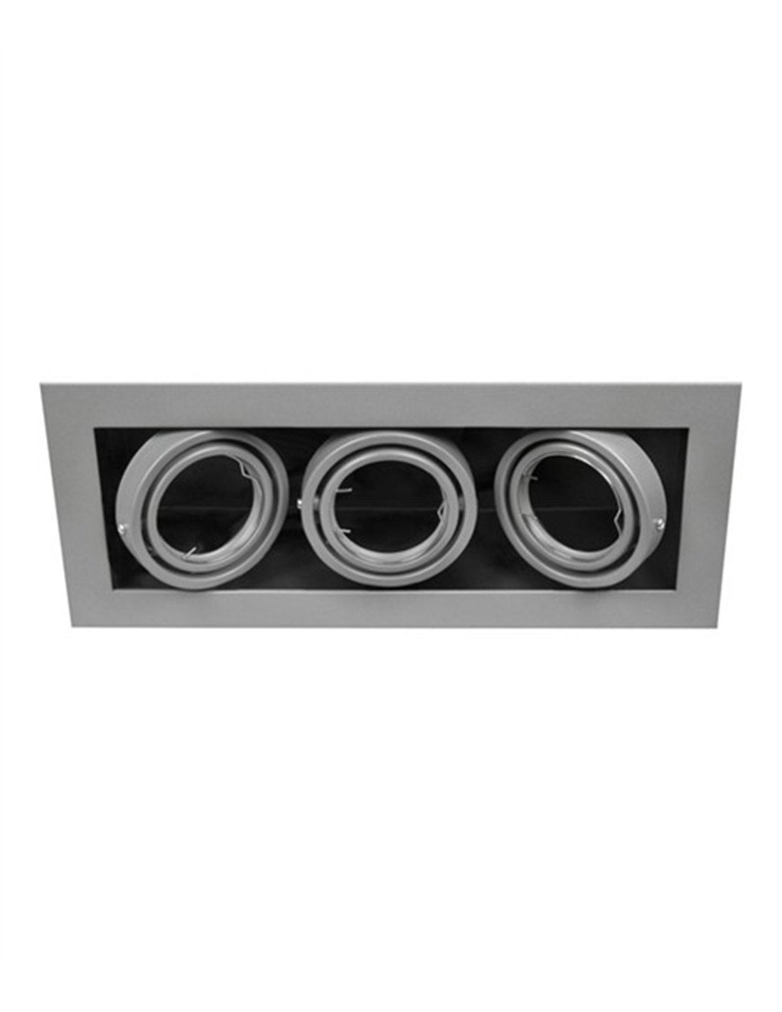 Lámpara de techo empotrable tipo cardán modelo 3010 en acabado gris, disponible con tres o cuatro luces. Fabricada en acero y compatible con bombillas de casquillo GU10 (no incluidas).