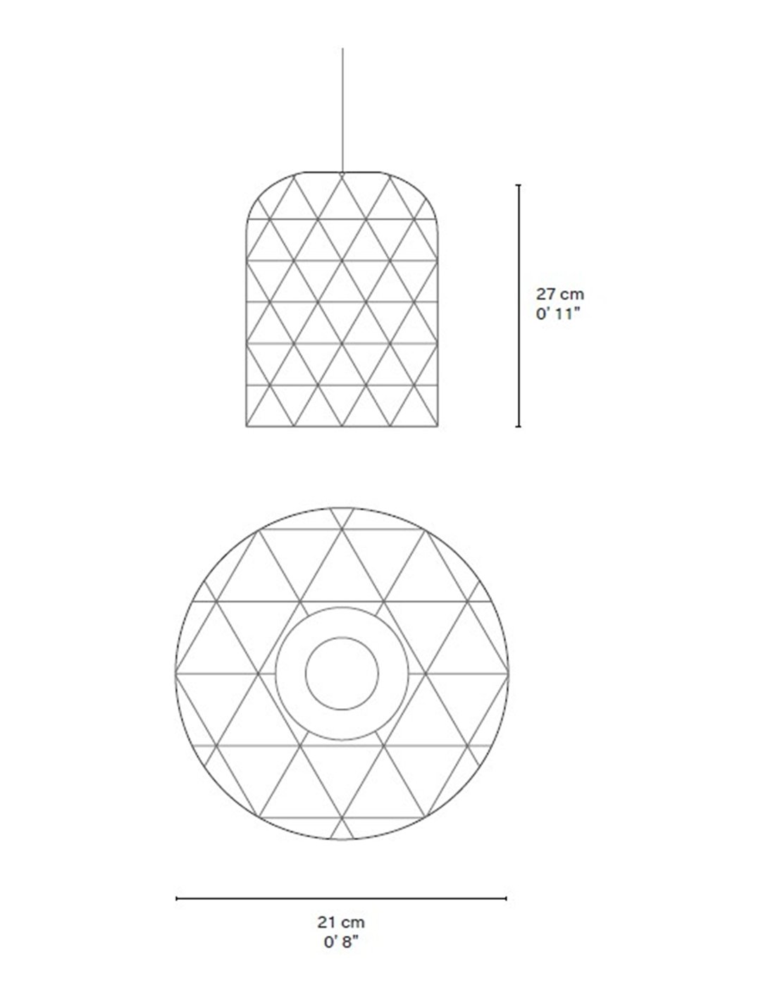 Este modelo de lámpara colgante corresponde al tamaño mediano de la colección y cuenta con una pantalla de 21 cm de diámetro y 27 cm de alto, donde predominan los tonos azul y verde. El diseño se completa con un cable textil negro de 150 cm, que permite ajustar su altura.