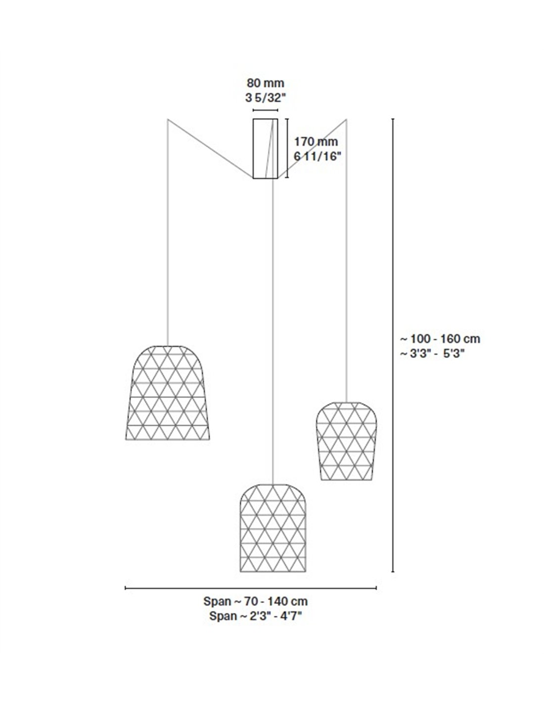 Este modelo se compone de tres pantallas de diferentes tamaños, dispuestas en forma de candelabro, que ayudan a distribuir la luz de forma equilibrada. La altura de caída es ajustable entre 150 y 200 cm, adaptándose a distintos tipos de techo.
