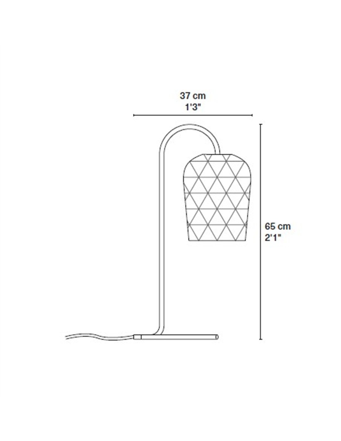 Tiene una altura total de 65 cm y un diámetro de pantalla de 37 cm. Integra con una bombilla E14 LED de 4W incluida, que ofrece una luz cálida de 2700K y una potencia de 400 lúmenes, adecuada para generar una iluminación ambiental suave en espacios interiores.