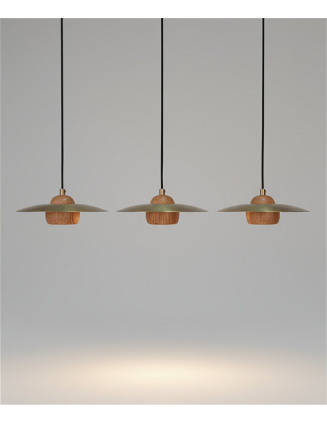 Sobre lámpara colgante Txapela de Pedret Lighting; diseño de Manex Bilbao Studio y Pedret, madera de roble oscuro o claro, disco de latón, Ø25 cm, altura 200 cm, GU10 máx. 6W