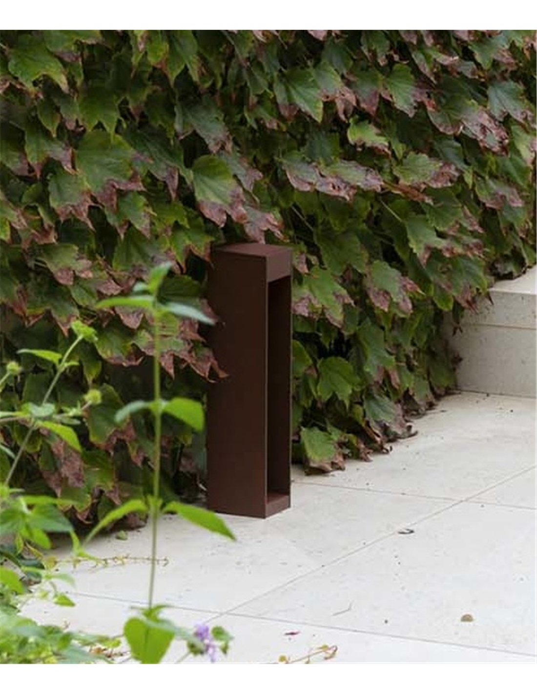 La baliza Cerler está diseñada para marcar caminos, entradas y zonas perimetrales. Se ofrece en gris oscuro o marrón óxido, dos acabados discretos que se integran bien en jardines y espacios arquitectónicos.