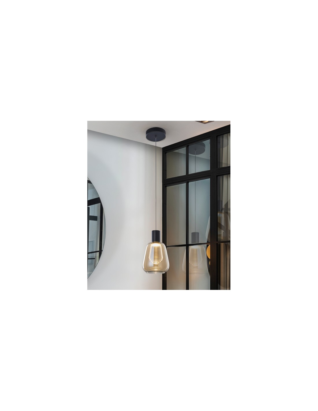 Carisa presenta una estructura de metal en acabado negro mate y una doble tulipa que define tanto su estética como su comportamiento lumínico. La tulipa exterior está fabricada en cristal ámbar, mientras que el difusor interior es de policarbonato transparente con franjas escalonadas.
