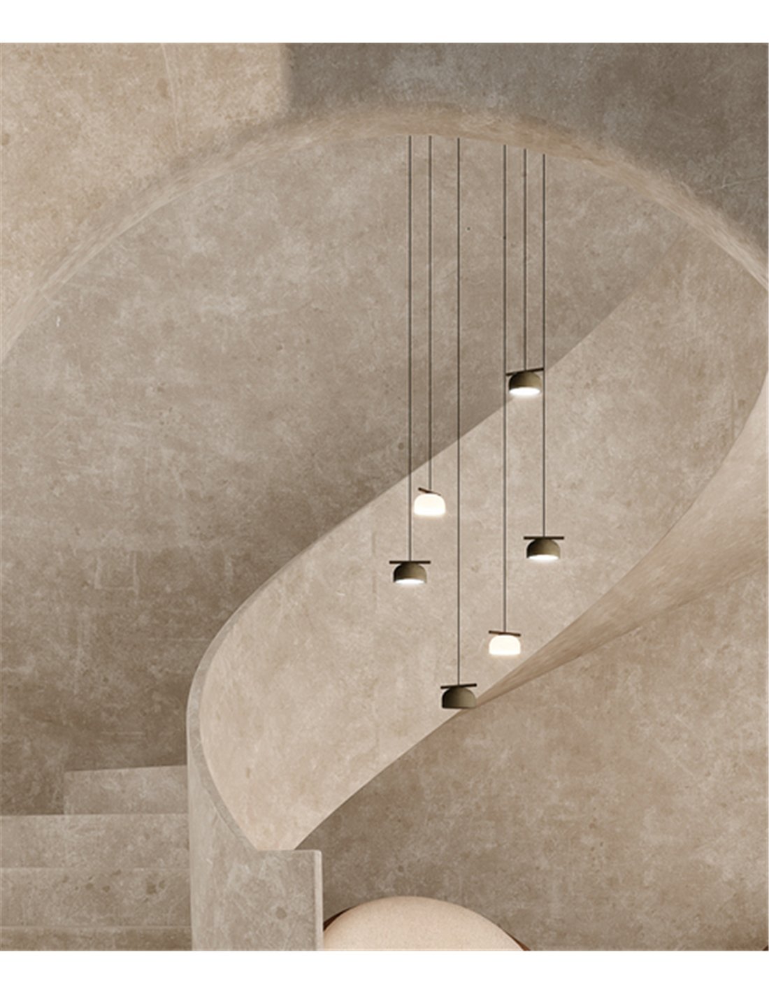 La estructura está disponible en cinco acabados: gris seda (beige), gris cemento (verde), marrón, rojo y negro grafito, facilitando su integración en proyectos residenciales y contract. La temperatura de color puede seleccionarse entre 2700K (cálida), 3000K (cálida neutra) y 4000K (fría). La fuente de luz es LED integrada en cada punto: 6 × 7W con 6 × 975 lúmenes (total aproximado 5850 lm), un nivel de iluminación adecuado como luz principal en estancias de 25 a 45 m², o como iluminación central sobre mesas grandes con apoyo perimetral en espacios aún mayores.
