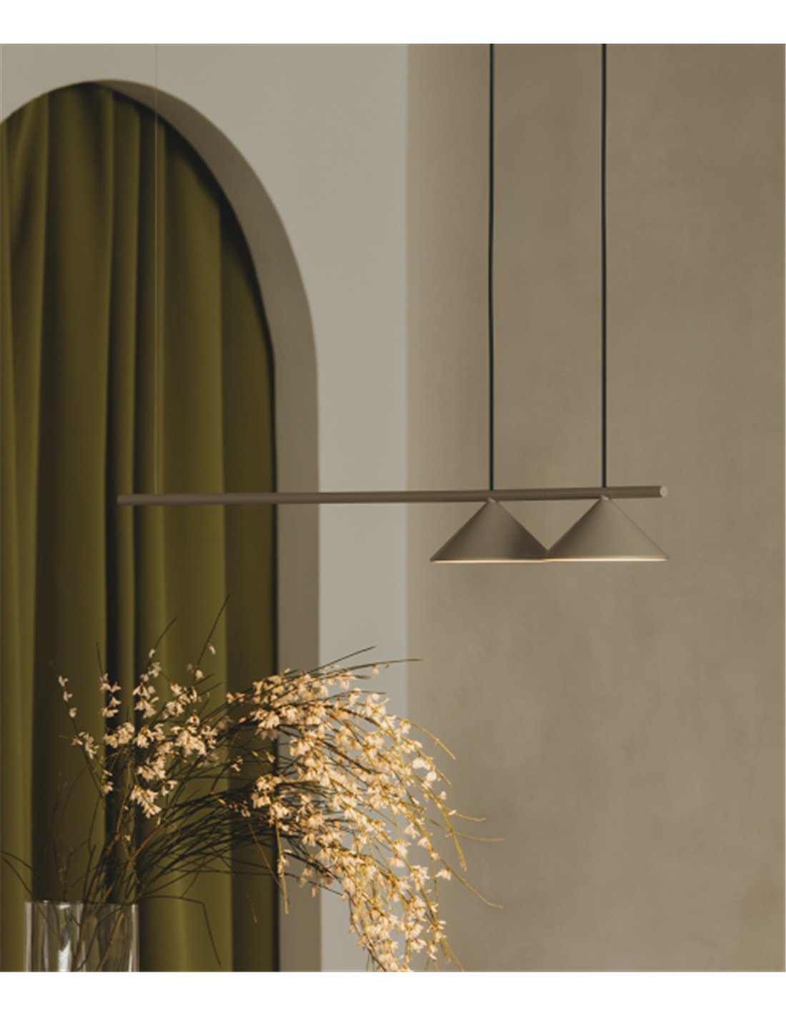 Belle Linear es una lámpara lineal diseñada para iluminar superficies concretas con una estética contemporánea muy atractiva. Se compone de una barra horizontal de 75,1 cm con dos pantallas cónicas, y toda la estructura está fabricada en aluminio. Está disponible en cinco acabados: gris seda (beige), gris cemento (verde), marrón, rojo y negro grafito. El sistema de suspensión incluye cable de 300 cm, adecuado para ajustar la caída en techos altos o para colocarla con precisión sobre mesas y barras.