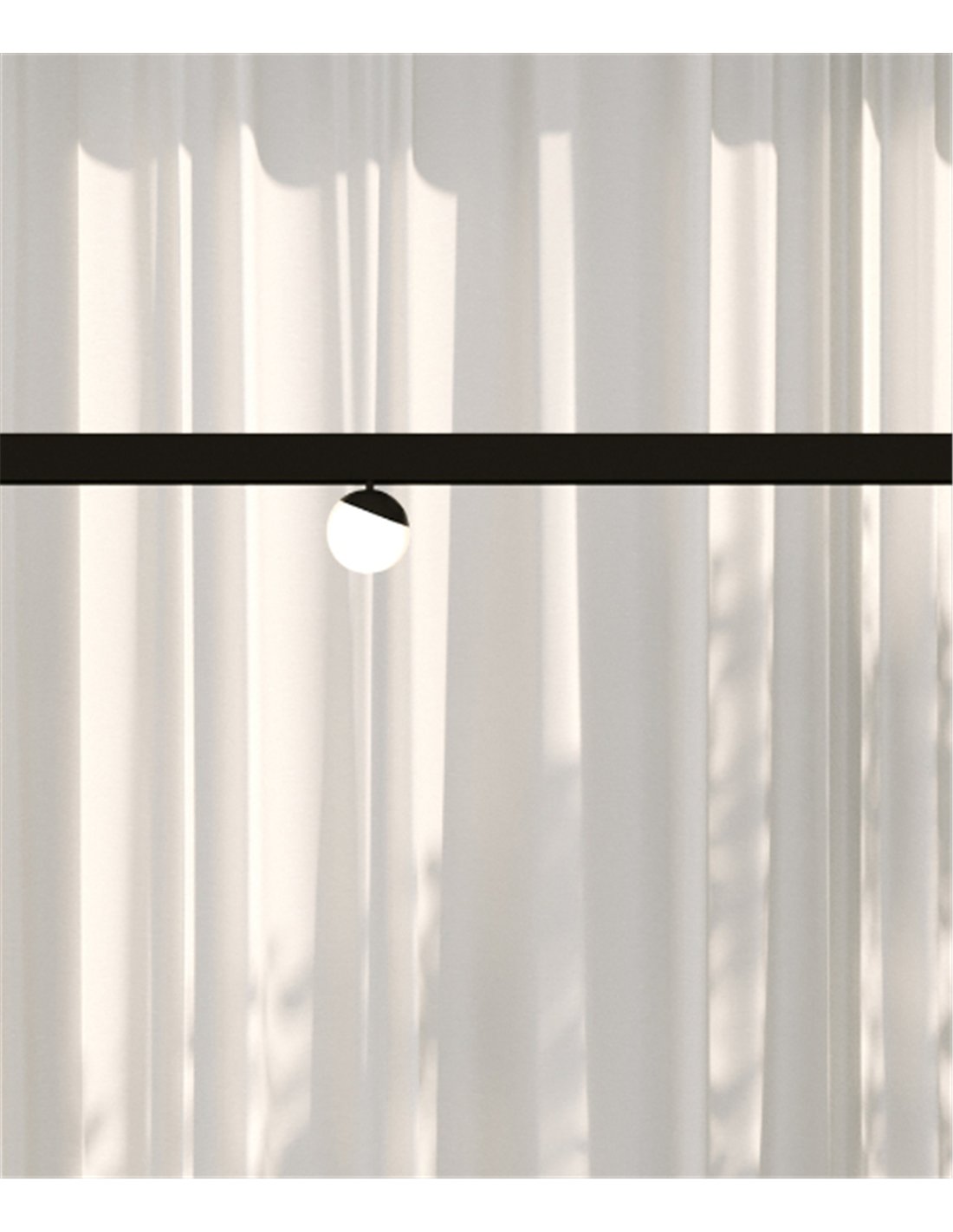 48V Ball Surface es una luminaria de superficie para carril de bajo voltaje (48V) que integra una esfera de vidrio opal de 9 cm de diámetro directamente en el carril, sin cable suspendido. La tulipa opal proporciona iluminación uniforme y omnidireccional, con un ángulo amplio de 120°, generando una luz ambiental suave y confortable.