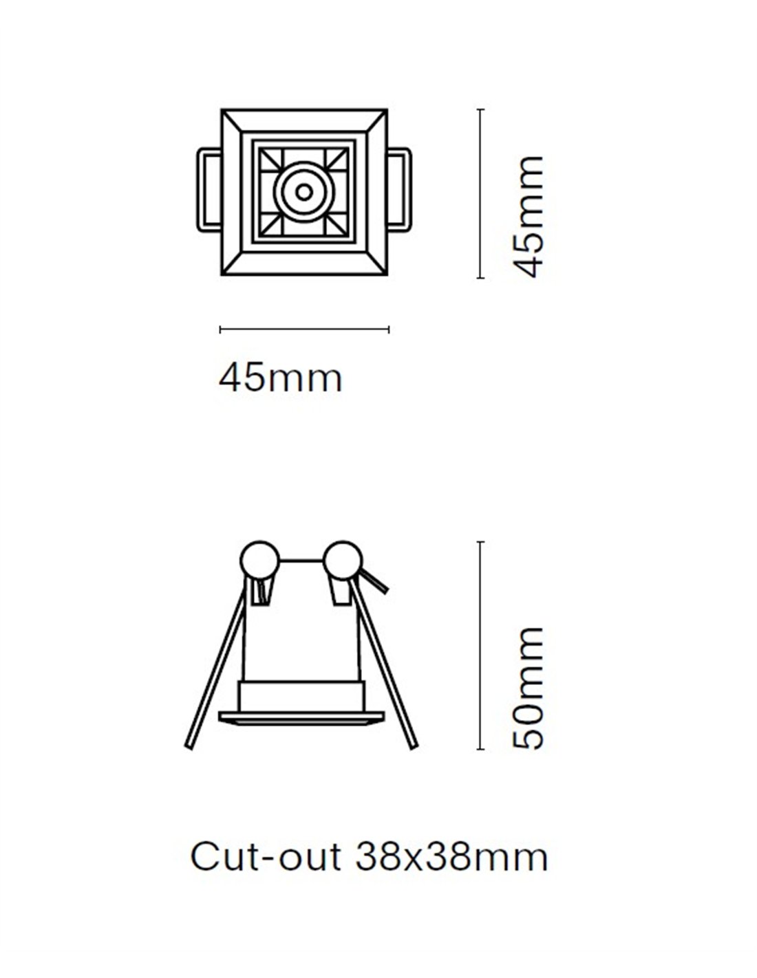 Sus dimensiones exteriores son 4,5 × 4,5 cm, con 5 cm de profundidad, y requiere un agujero de 3,8 x 3.8 cm. Integra LED de 2W y 210 lúmenes, un flujo adecuado para luz de acento y señalización de zonas concretas, no como iluminación general única.