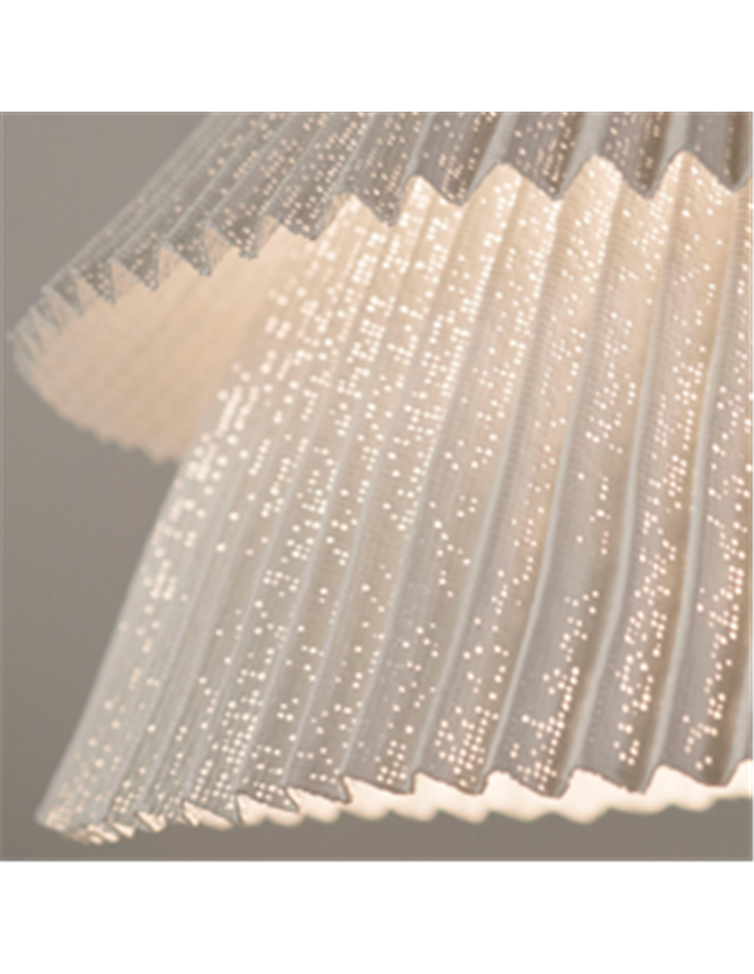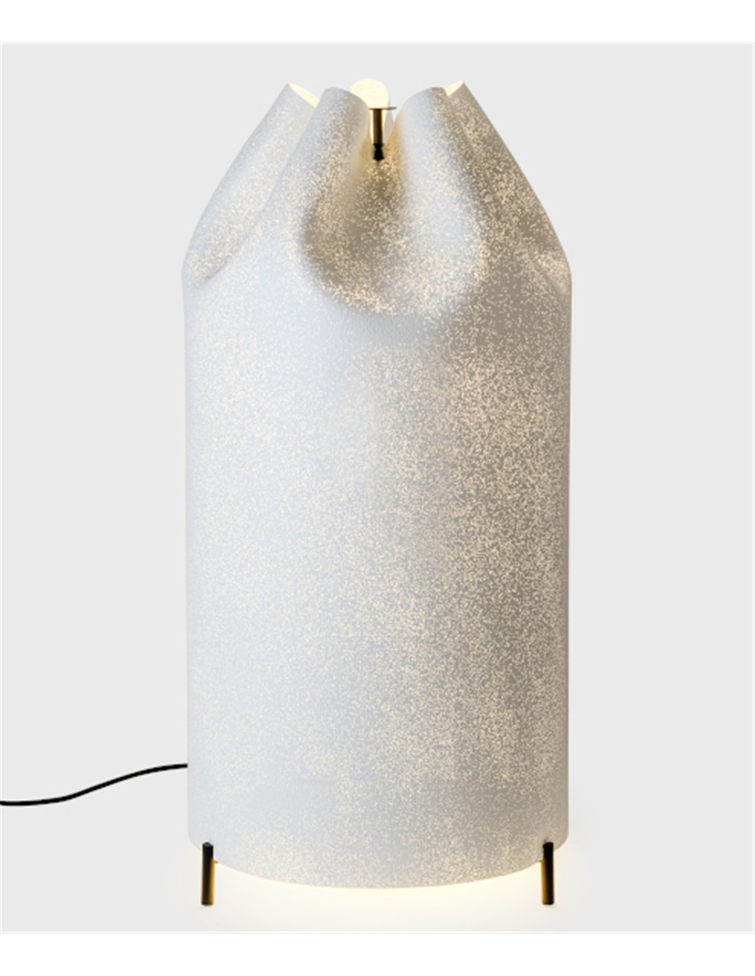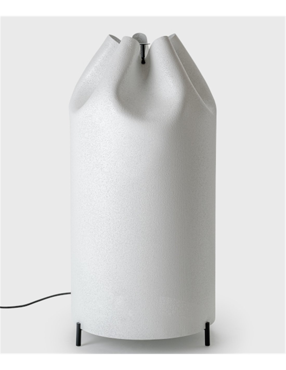 Agasallo es una lámpara de pie decorativa fabricada en malla de acero inoxidable, disponible en blanco, beige, gris, topo o negro. La malla deja pasar parte de la luz y genera una iluminación suave, adecuada para crear ambiente y acompañar la iluminación general.