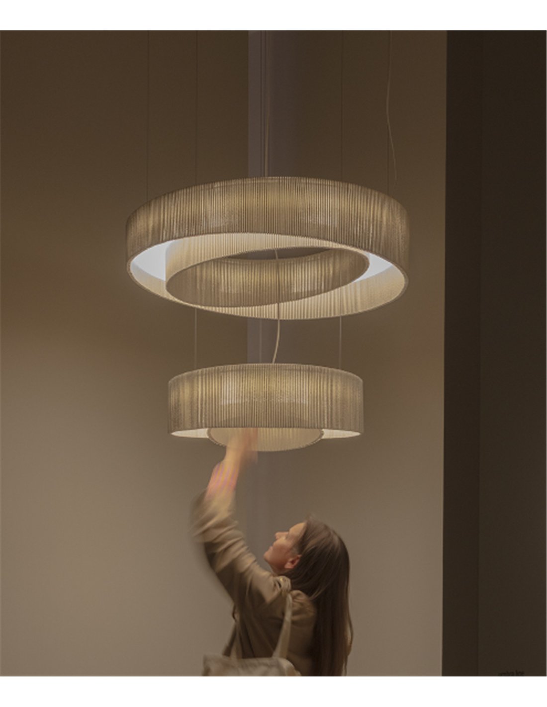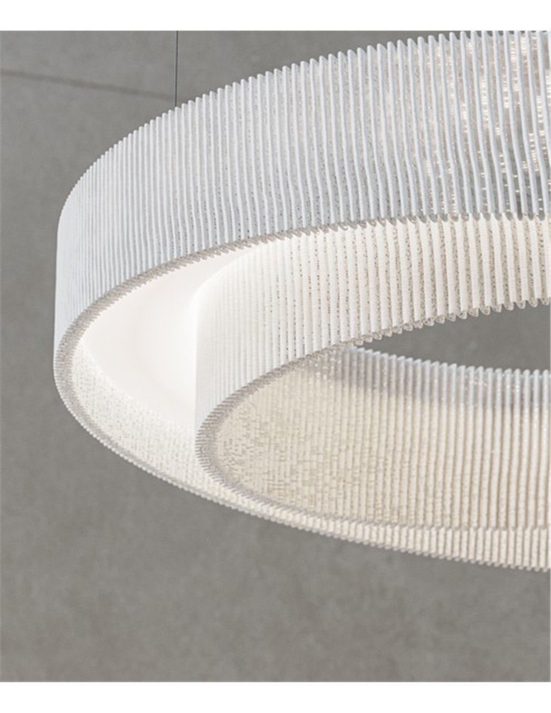 La lámpara colgante Anel destaca por su diseño escultórico formado por una pantalla de malla de acero pintada en blanco mate, junto al difusor formado por un anillo concéntrico que genera un interesante juego visual, como si un anillo flotara dentro de otro.