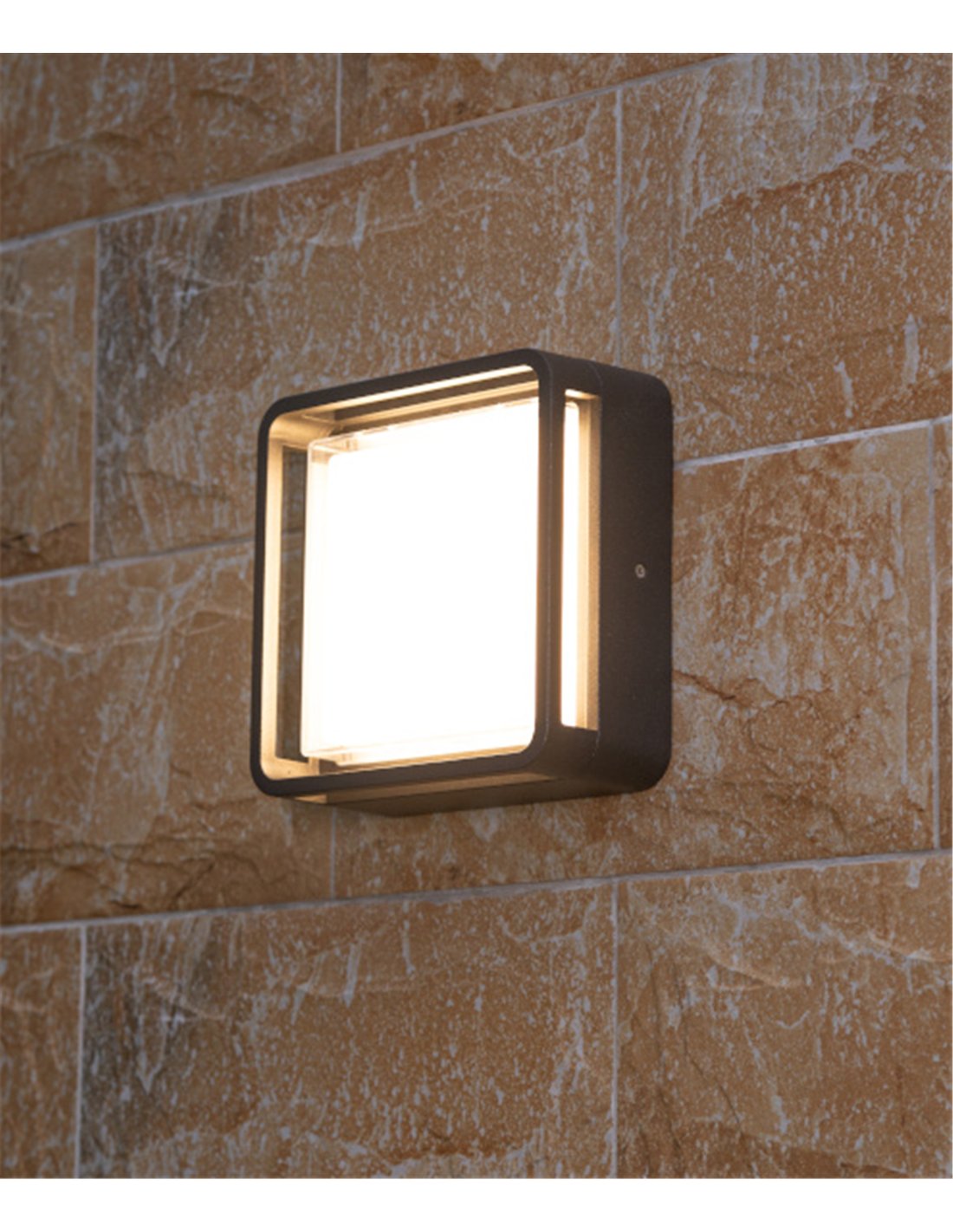 Alhambra es una lámpara de exterior apta para instalación en pared o techo, con diseño cuadrado de 22 cm por lado y acabado antracita. El cuerpo está fabricado en aluminio por inyección y el difusor en PC opal, que reparte la luz de forma uniforme y reduce el deslumbramiento. El marco perimetral protege el difusor y aporta un aspecto compacto y actual para fachadas y zonas de paso. Cuenta con IP65 para uso al aire libre.
