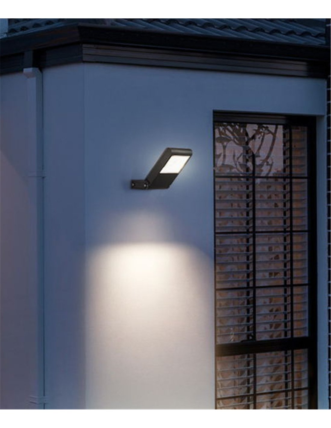 Integra fuente LED de 12W con 1171 lúmenes y un ángulo de apertura de 180°, lo que proporciona una iluminación amplia y homogénea, útil para zonas de paso y paredes donde interesa cubrir superficie sin crear puntos muy marcados. El acabado antracita permite integrarlo en fachadas modernas y carpinterías oscuras. La pantalla orientable ayuda a dirigir la luz hacia el suelo, un acceso o un elemento concreto de la pared.