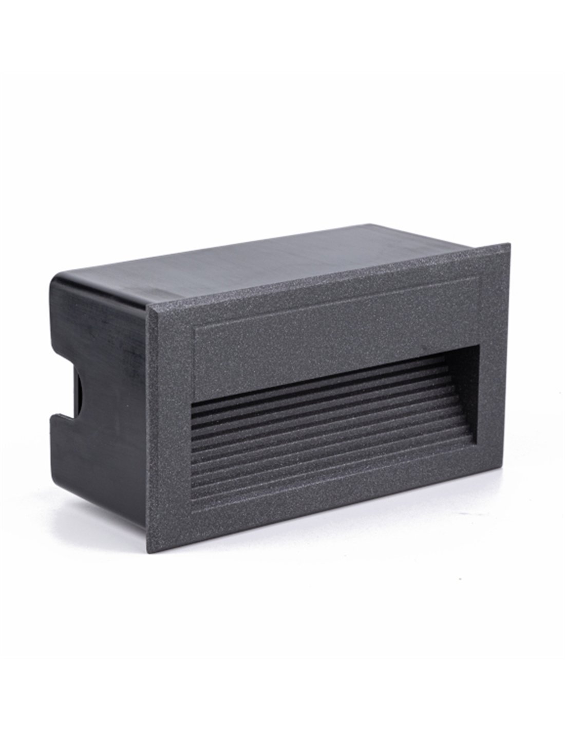 Valle es un empotrable de pared de exterior pensado para señalizar recorridos y aportar luz de orientación a baja altura. Presenta un formato lineal de 18 cm en acabado antracita, con frontal rectangular y una apertura retranqueada con lamas, que ayuda a ocultar la fuente de luz. Su protección IP65 permite instalarlo en fachadas y paredes expuestas a polvo y lluvia.