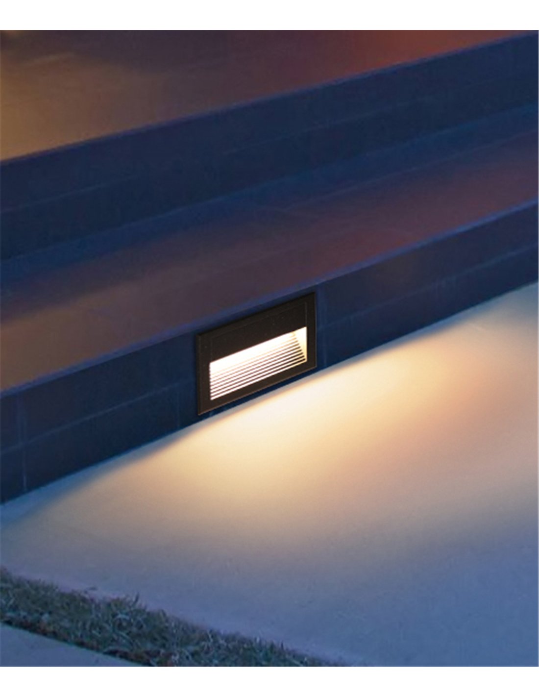 Integra LED de 6W con 160 lúmenes y temperatura de color 3000K (cálida-neutra). Por su flujo luminoso, su uso es de señaización: marcar escalones, bordes y tramos de circulación, no iluminar una estancia completa.