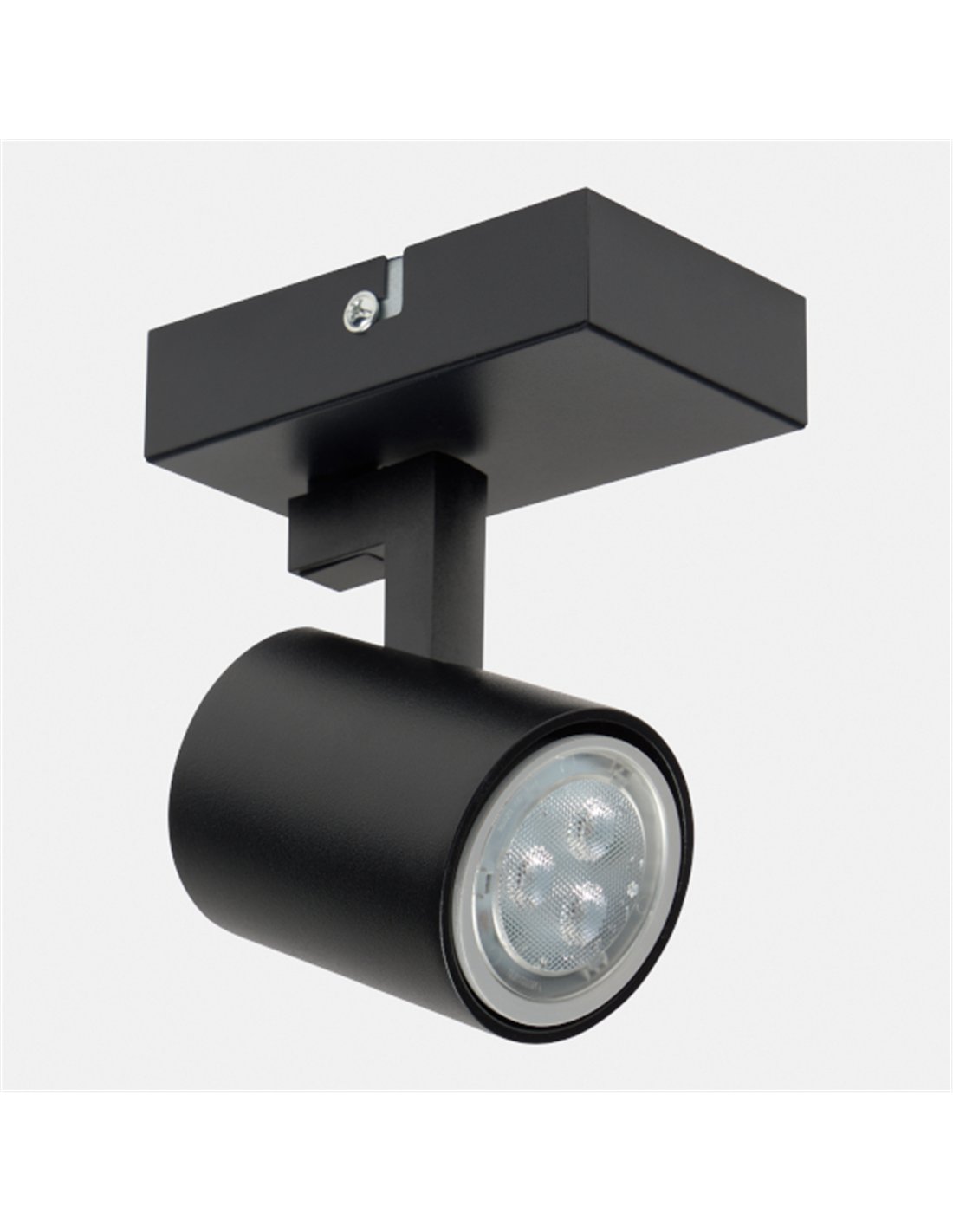 Kaplan es un foco de techo de superficie con luz orientable, diseñado para iluminación puntual y de apoyo en interiores. Presenta una base rectangular y un cabezal cilíndrico orientable, disponible en acabado blanco o negro. La estructura está fabricada en aluminio.