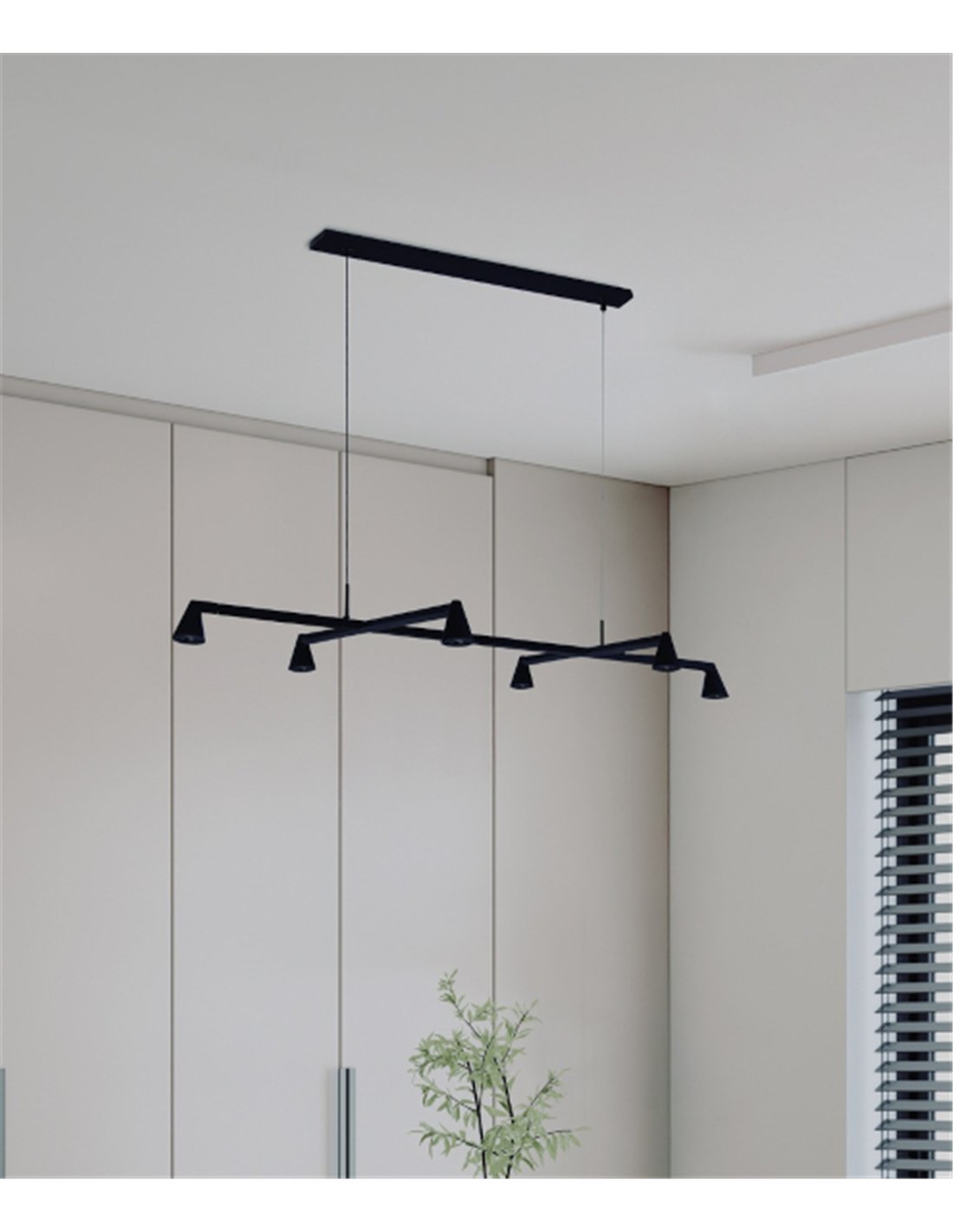 Su practicidad es otro de sus puntos fuertes, ya que permite ajustar la altura mediante sus cables hasta 1,5 metros, adaptándose perfectamente tanto a techos de altura estándar como a espacios más altos.