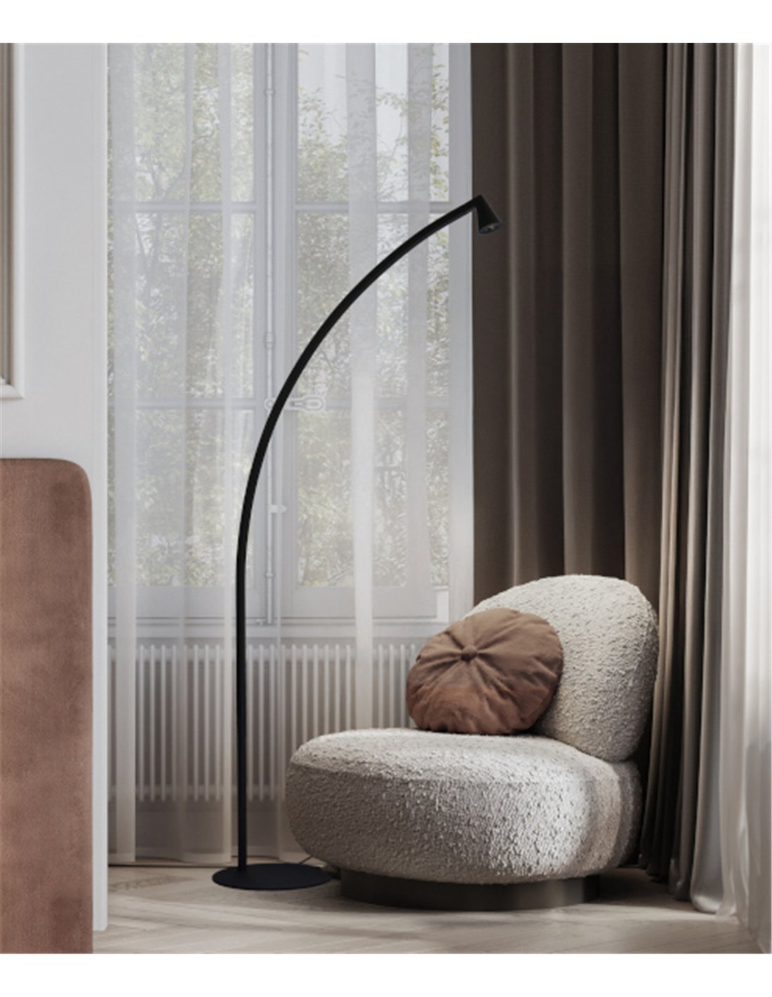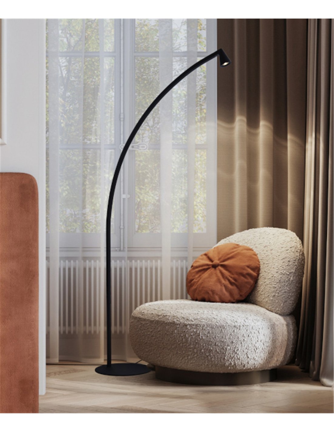 Su elegante estructura curva en negro no solo es una pieza decorativa de primer nivel, sino que está diseñada para "asomarse" sobre tu sofá, butaca o mesa de centro, ofreciéndote una iluminación directa y súper cómoda para tus momentos de relax o lectura. Al ser una lámpara de arco, te da esa libertad de iluminar un punto concreto de la habitación manteniendo el resto en una penumbra suave y agradable.
