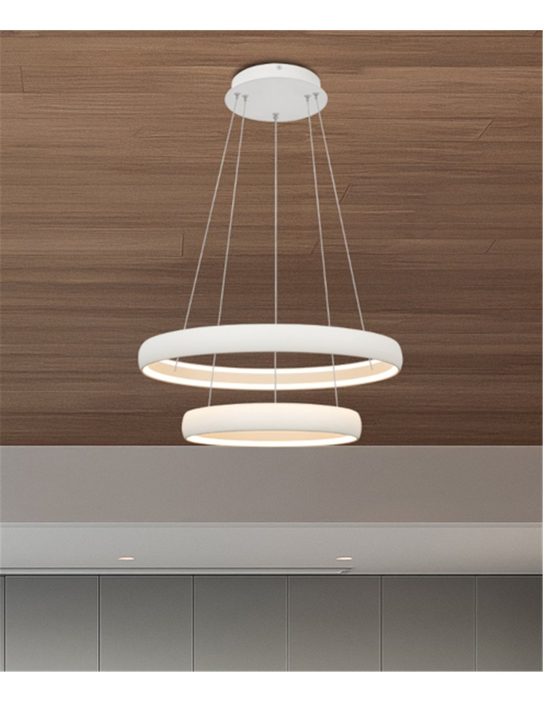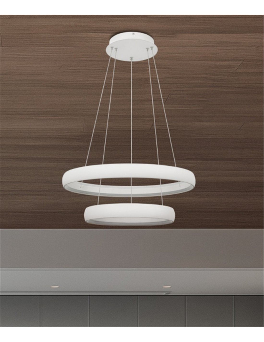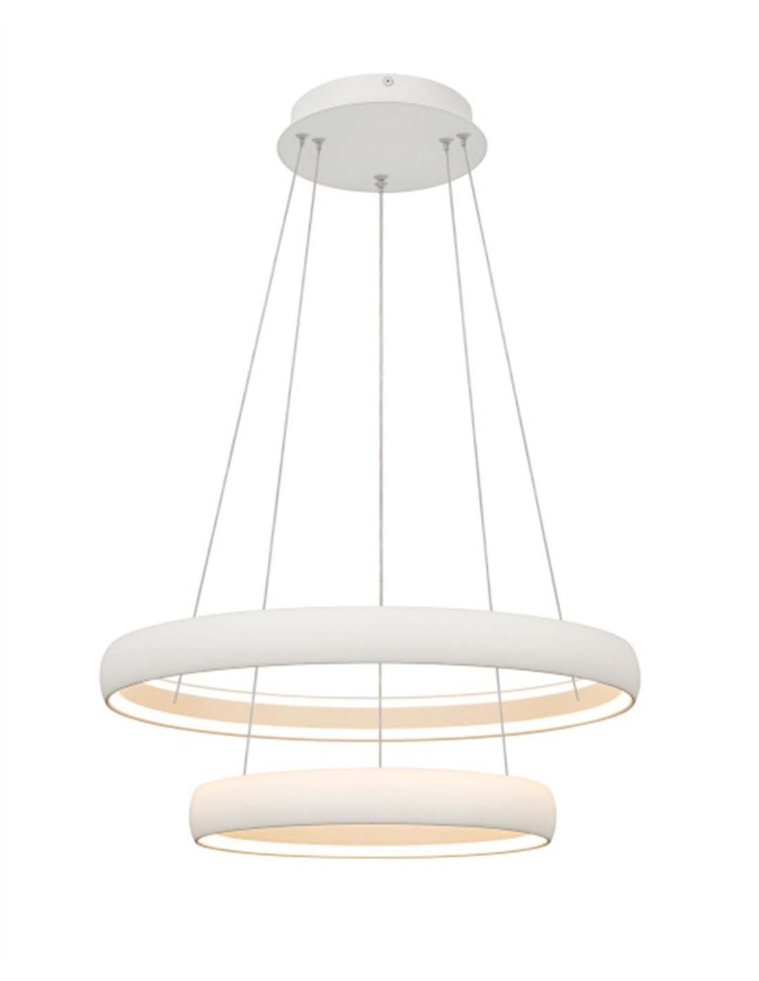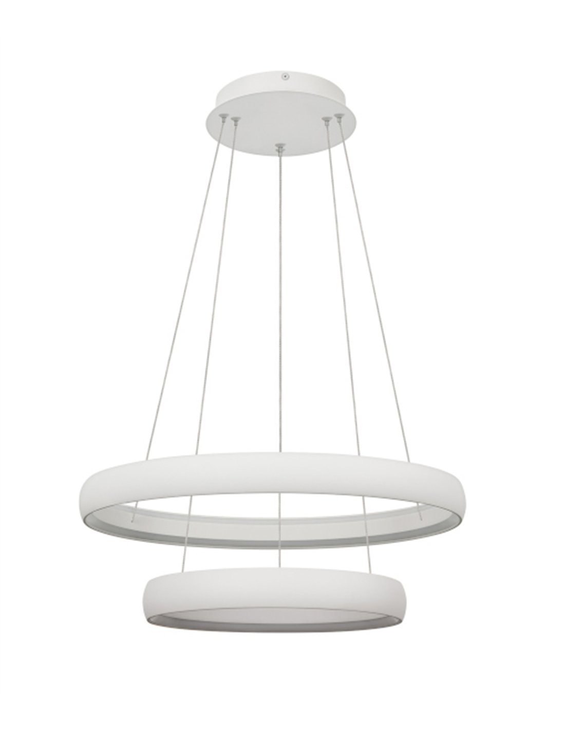 Sobre lámpara colgante Flats de Mantra; diseño moderno con 2 aros, LED 70W 3000K, acabado blanco, altura ajustable, regulable Triac