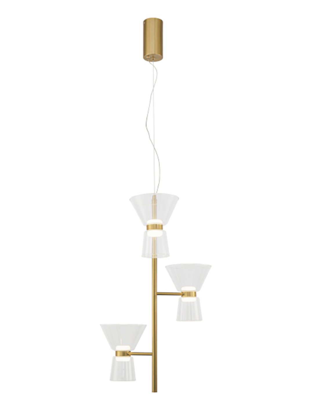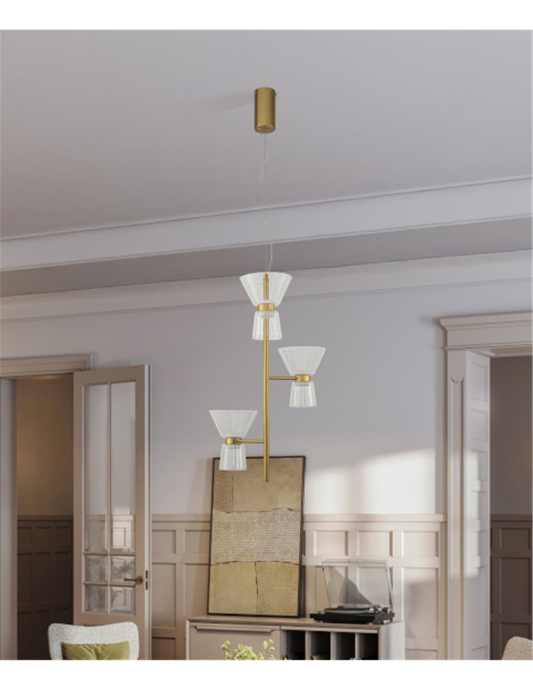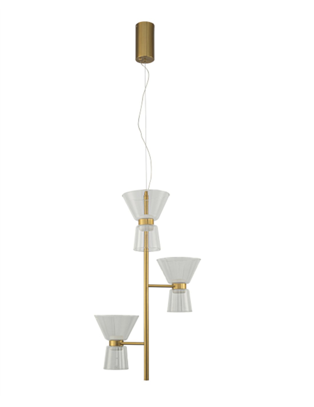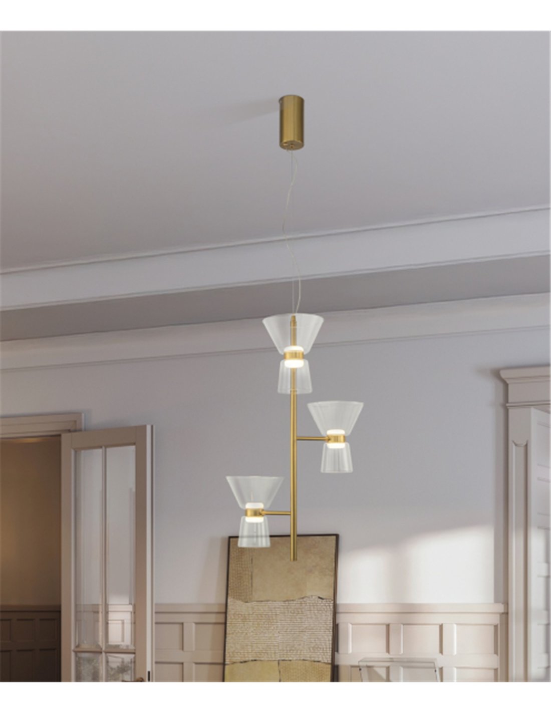 La lámpara colgante New York destaca por su elegancia vertical, diseñada para quienes buscan algo más que una simple luminaria: una escultura suspendida que define el carácter de una habitación. Con sus tres puntos de luz dispuestos de forma escalonada, juega con la transparencia del cristal y la sofisticación del acabado en oro, creando un conjunto dinámico y ligero que encaja a la perfección sobre una mesa de comedor o en espacios de techos altos.
