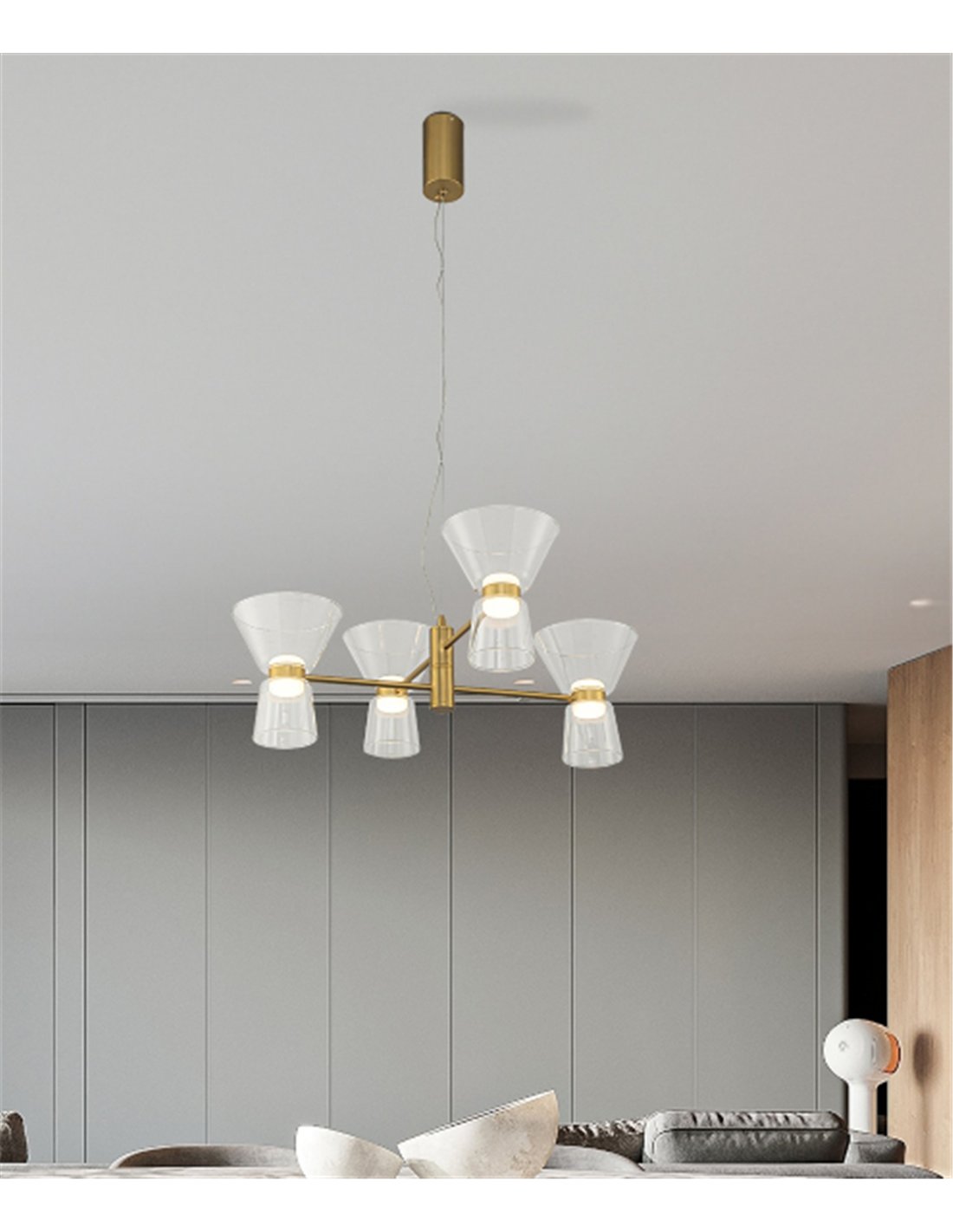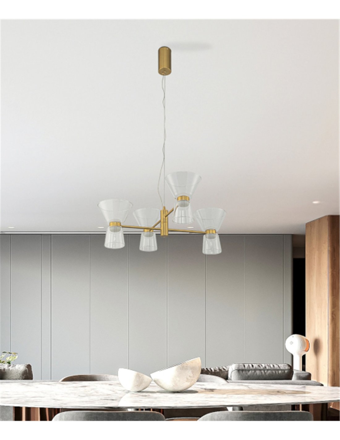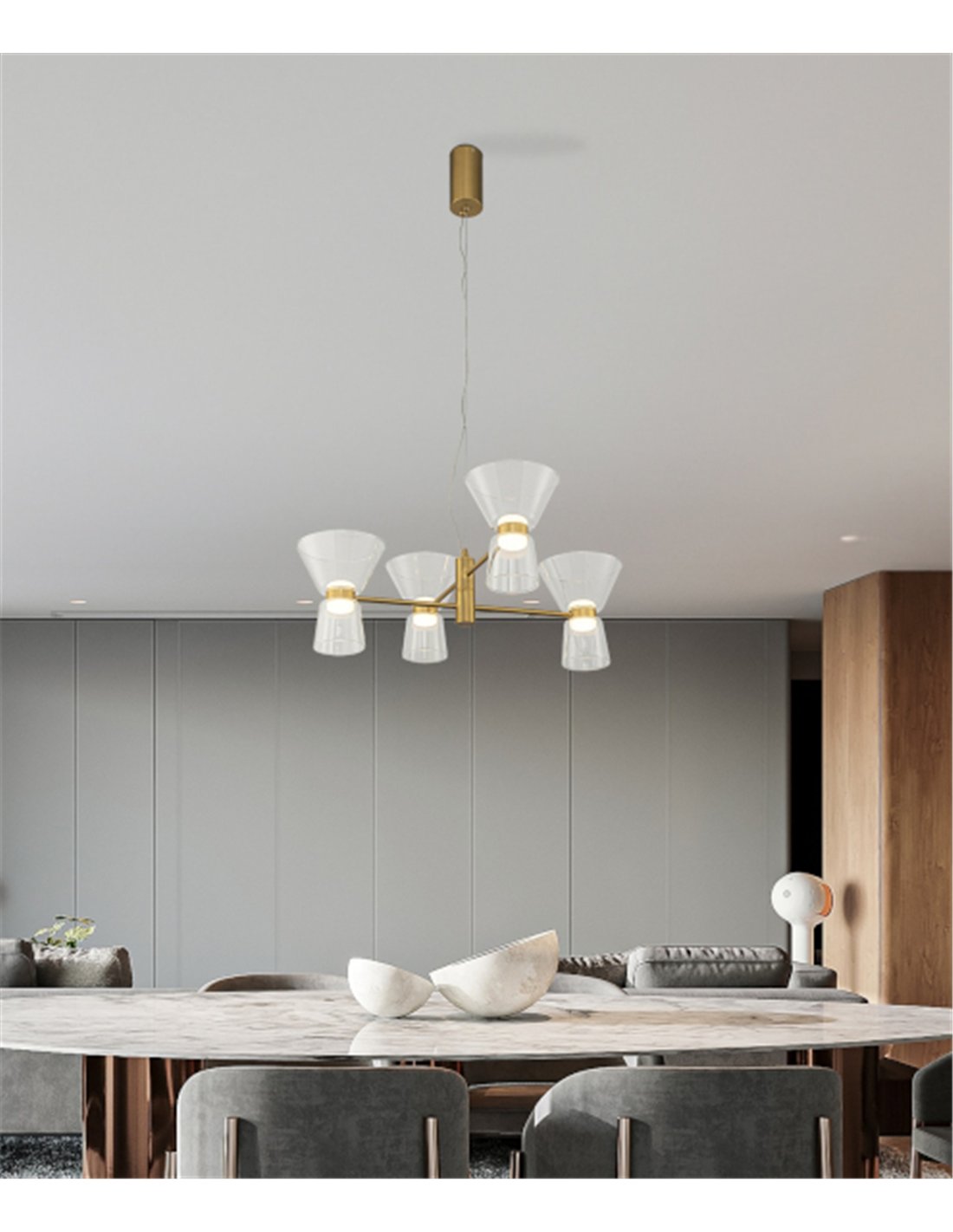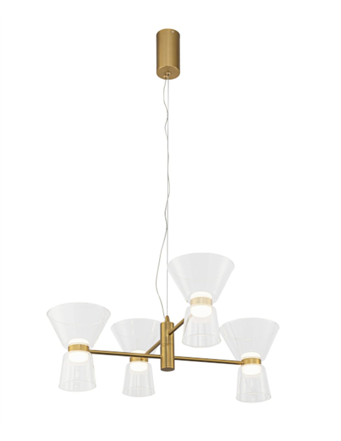 Sobre lámpara colgante New York de Mantra; lámpara decorativa tipo araña moderna, acabado oro, pantallas de cristal, LED 3700 lm 3000K, altura ajustable