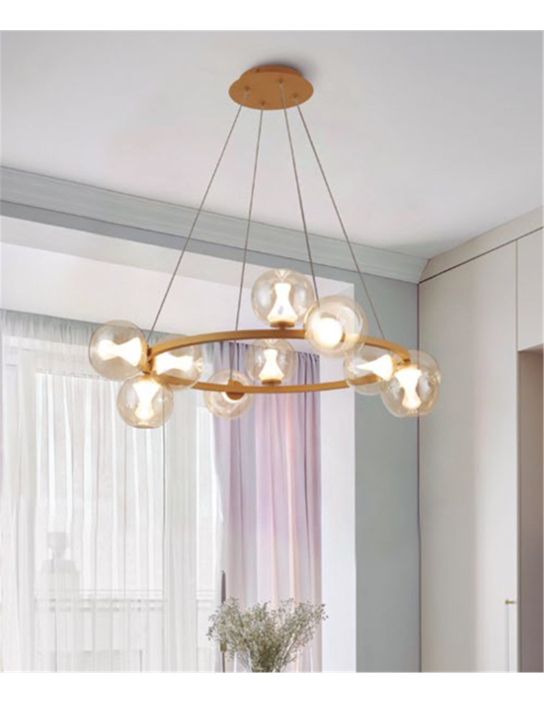 Su diseño circular con diez difusores de cristal redondeados luce especialmente bien sobre mesas redondas o presidiendo el salón, siempre buscando que la pieza tenga aire suficiente para lucir su estética equilibrada sin recargar el conjunto.