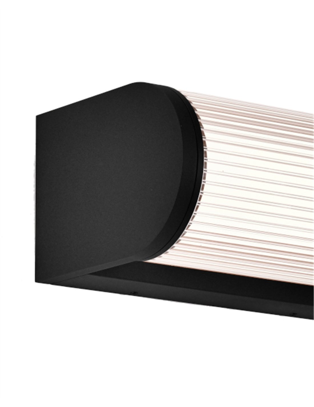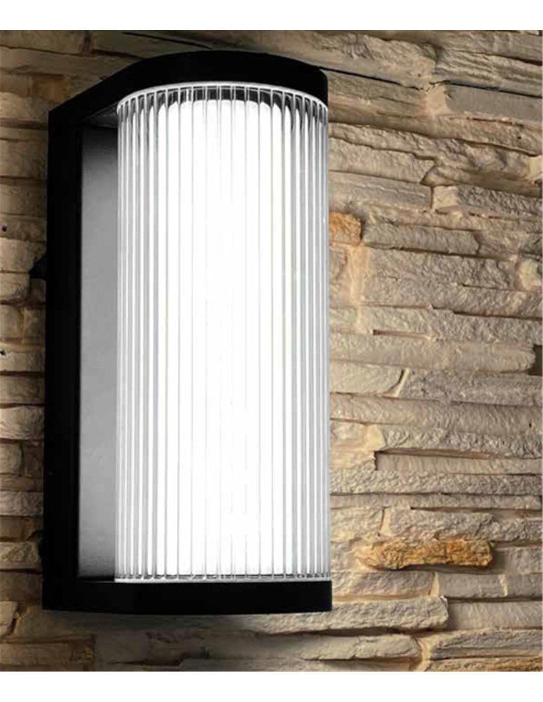 El aplique Gant es una de esas piezas que consiguen que una pared exterior deje de ser una simple superficie para convertirse en un elemento con textura y carácter. Destaca por una combinación de formas geométricas muy sugerente: una base recta de líneas puras que sostiene un difusor cilíndrico horizontal con superficie estriada, disponible en negro o marrón. Este detalle de las estrías no es solo un capricho decorativo; genera un juego de sombras y relieves que aporta una imagen contemporánea y técnica.