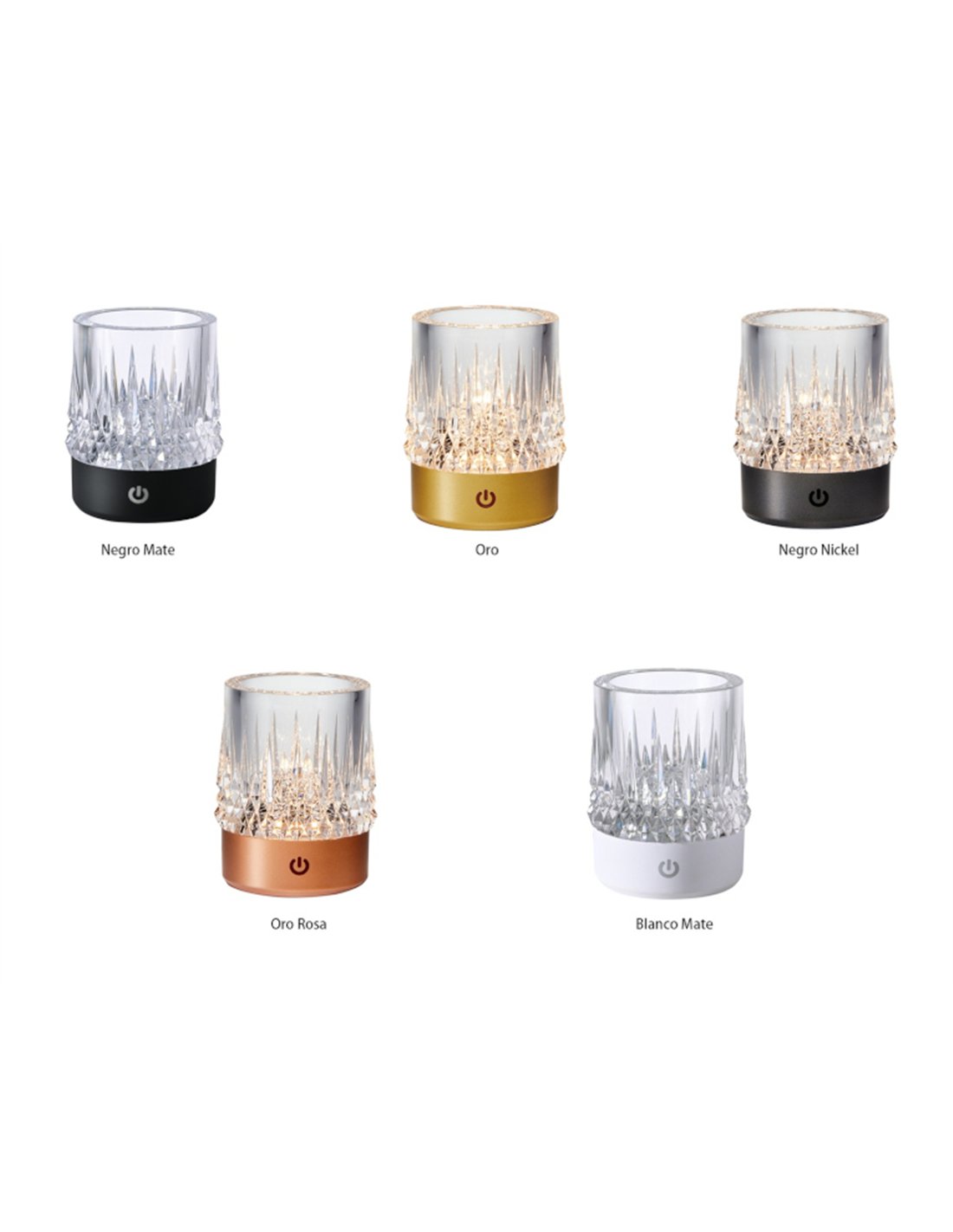 Con apenas 10,5 cm de altura y un diámetro de 7,8 cm, esta lámpara de mesa fabricada en ABS y PE se presenta como una pieza de diseño sofisticado y versátil. Su gran atractivo visual reside en el contraste entre su base cilíndrica lisa y un difusor transparente que imita la elegancia del vidrio tallado. Está disponible en una paleta de acabados que va desde el blanco y negro mate hasta los lujosos oro, oro rosa y negro níquel.