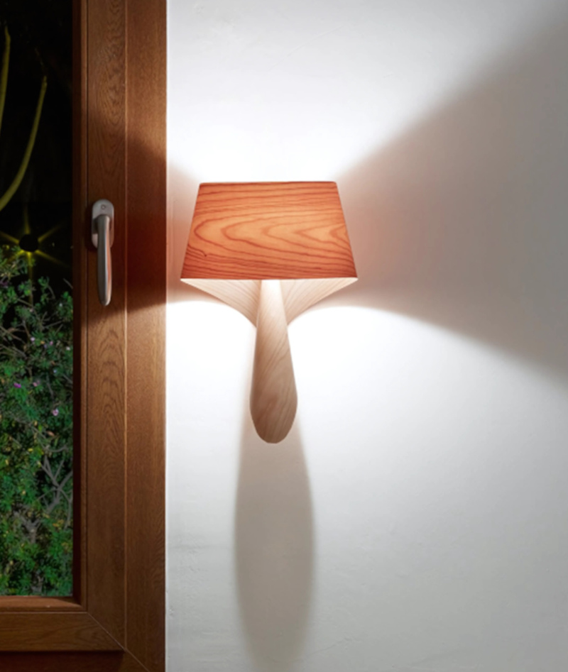 «Buscábamos un aplique sencillo, que pasara desapercibido. Creemos que funciona muy bien en hoteles, para habitaciones o pasillos y también en hogar. De hecho, esta lámpara la diseñamos en primer lugar como solución a una bombilla teníamos suelta en la pared de nuestro primer estudio, lo solucionamos de una forma fácil curvando un vinilo sobre la misma, esto se convirtió en lo que luego sería Pleg.»
