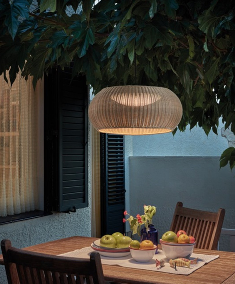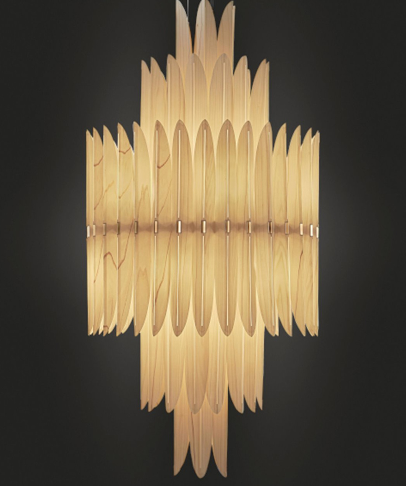 Fred es la plasmación sencilla de una idea compleja. Realizada en materiales ligeros, proyecta la luz escalonadamente para crear un efecto  único sobre la mesa del salón.