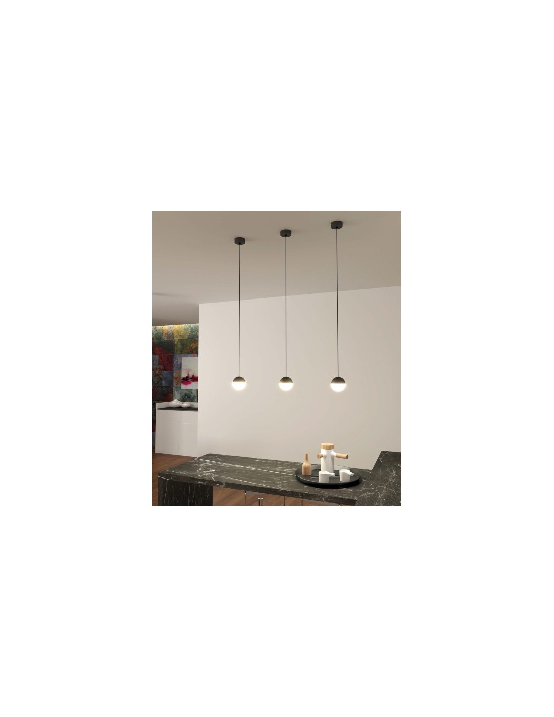 The Custo pendant light has a metal structure, available in textured black or technical gold finishes, while the acrylic shade with opal finish ensures a soft and homogeneous diffusion of light.