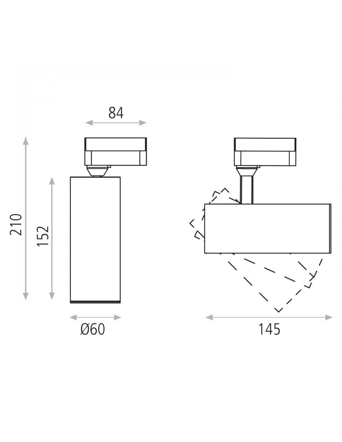 Regarding size, the cylinder has a diameter of 6 cm and a height of 15 cm, while the entire piece measures 21 cm including the height of the track. The track is not included with the purchase of the spotlight.
