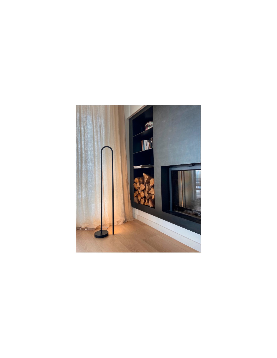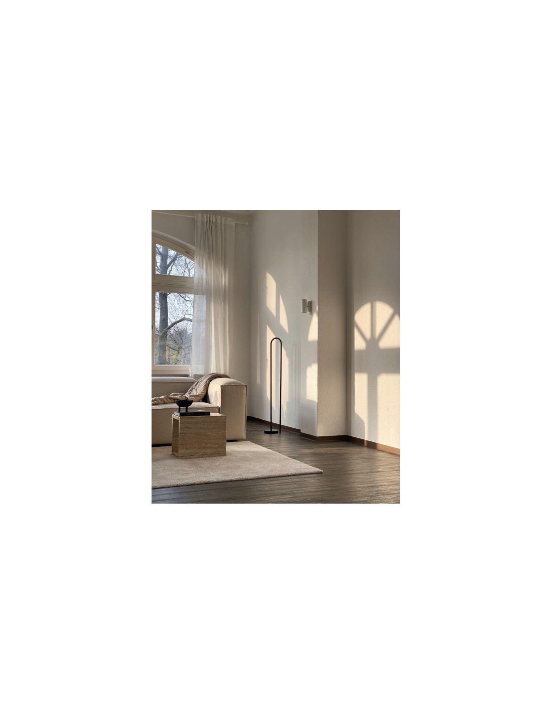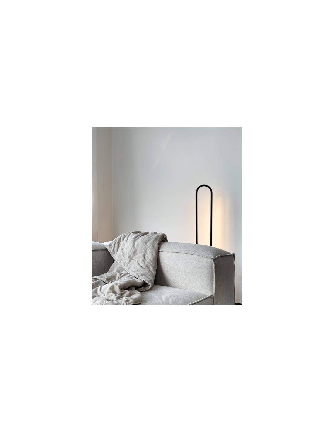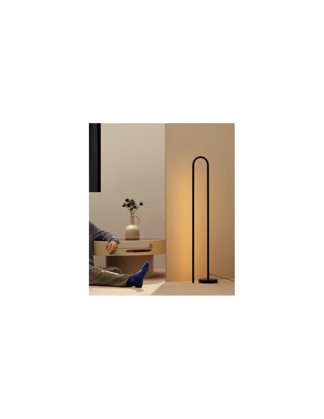 The Bow floor lamp is designed to create a distinctive lighting effect through backlighting, offering soft ambient illumination. It features a minimalist aesthetic with a curved aluminium structure in a black finish, in which one of its sections acts as a linear shade. This shade can be easily adjusted, allowing the light to be directed toward the wall or angled to create different atmospheres.