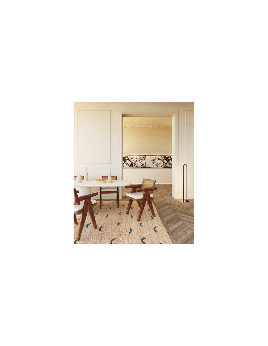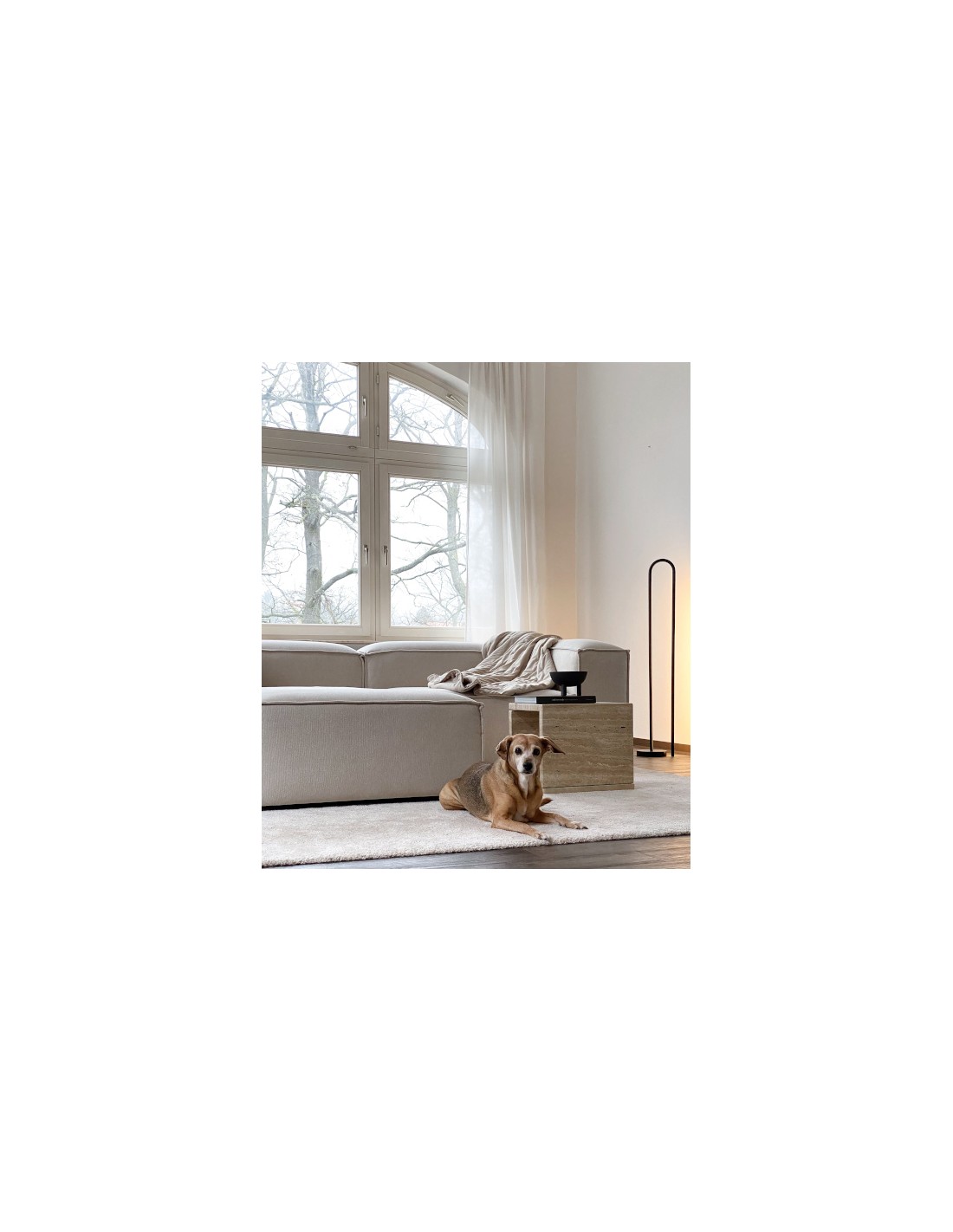 It stands 120 cm tall, making it ideal for lighting living rooms, bedrooms or relaxation areas in rooms of 10 to 16 m² (when used as the main light source). Its integrated LED light source (22W, 1944 lumens, 2700K) provides warm illumination.