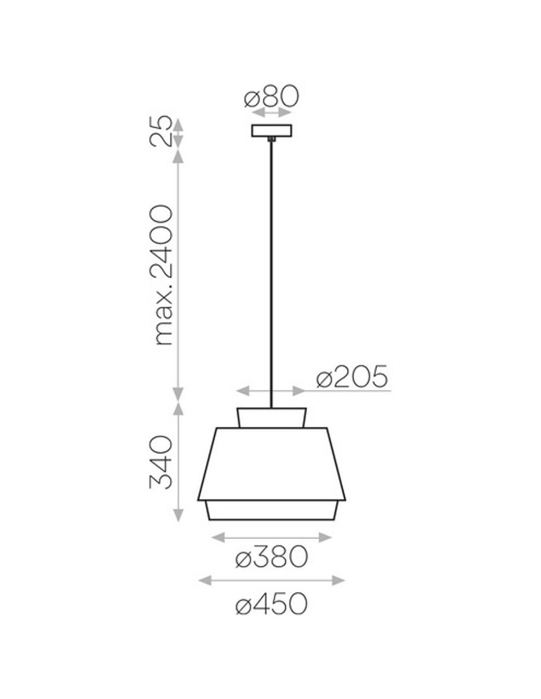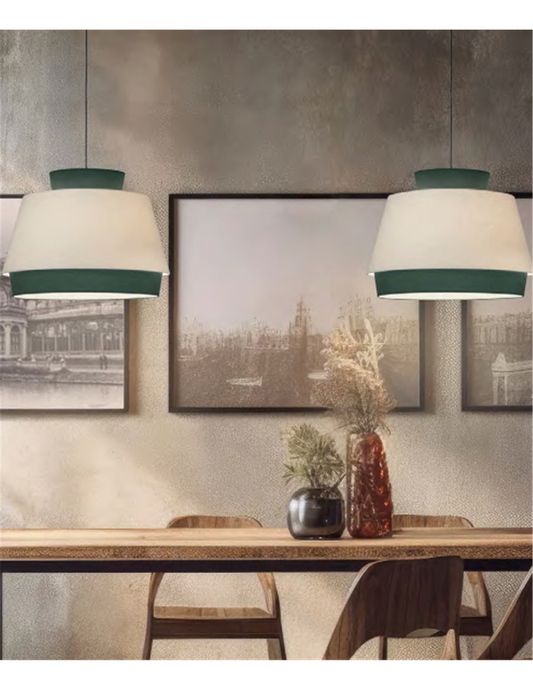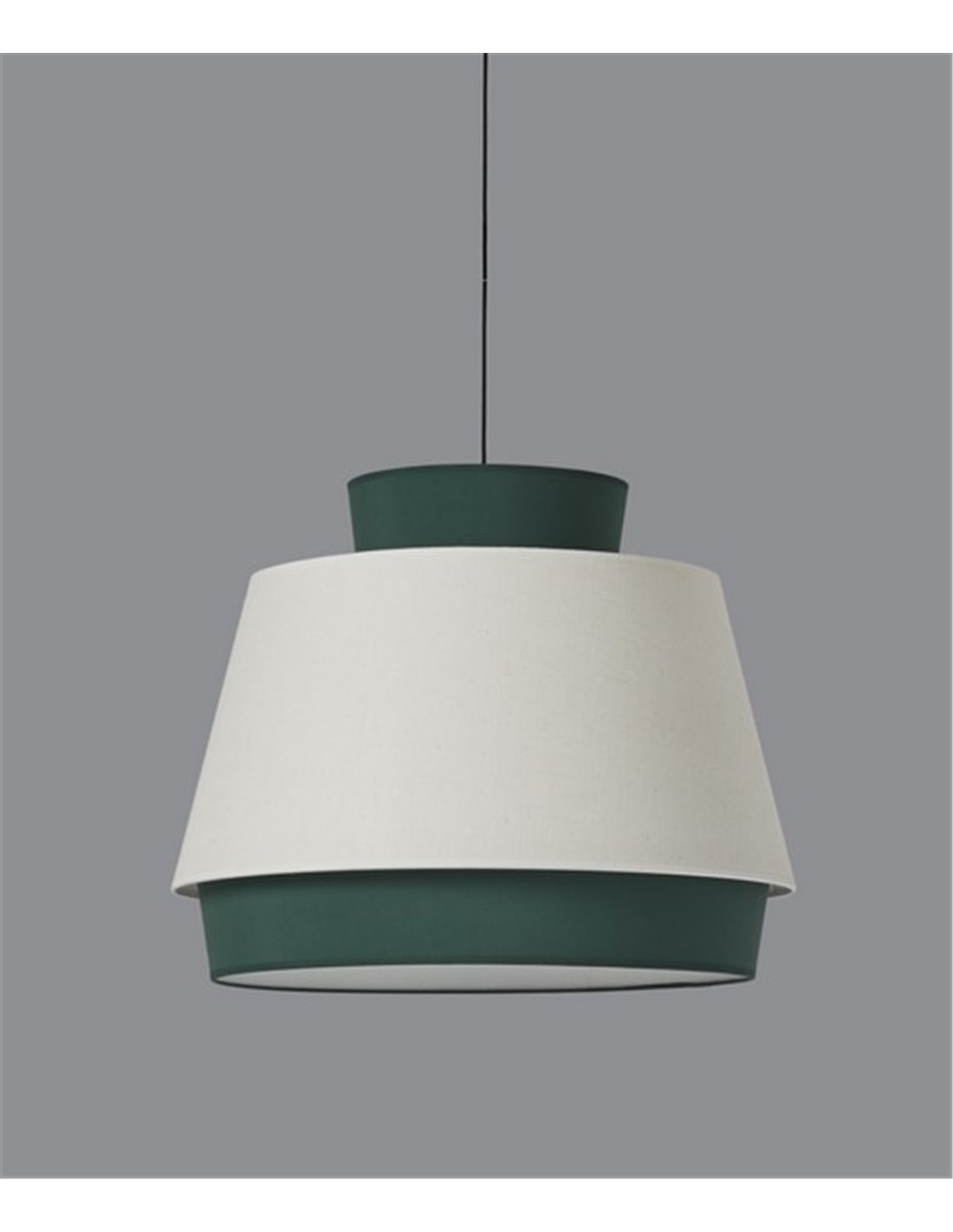 Handmade in Spain, its shade is composed of cotton fabric (inner shade) and linen (outer shade). It is available in three finishes: white–linen; sand–linen; and green–linen, and in two sizes: 50 cm x 40 cm x 50 cm and 65 cm x 50 cm x 65 cm (width x length x height). The cable is textile and the ceiling canopy is metal, both in black.